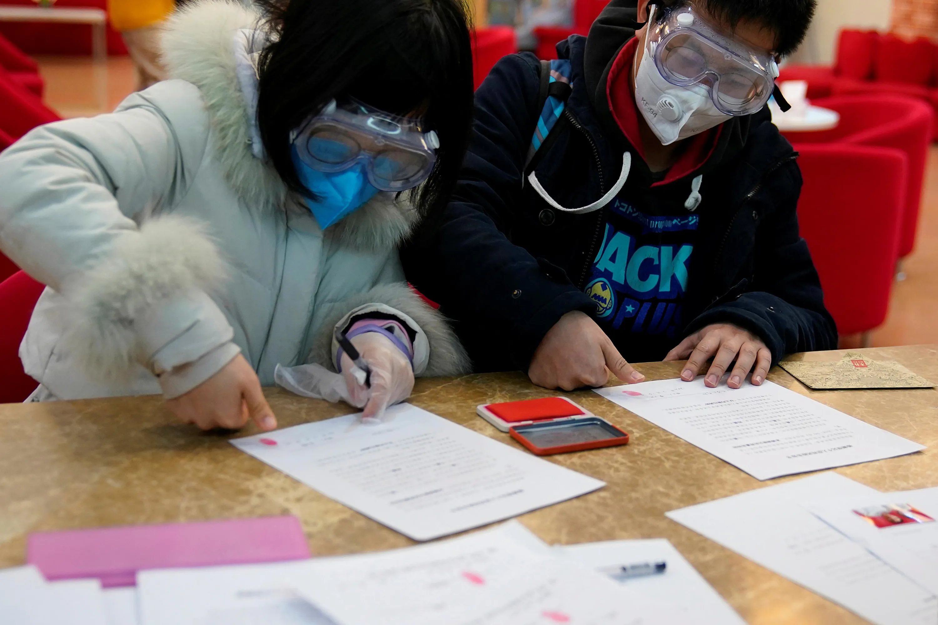 Jia, 29, and his wife Su, 28, wearing masks take impression of fingerprints at a registration session at a marriage registry office on Valentine's Day in Shanghai, China, as the country is hit by an outbreak of the novel coronavirus, February 14, 2020. (Photo by Aly Song/Reuters)