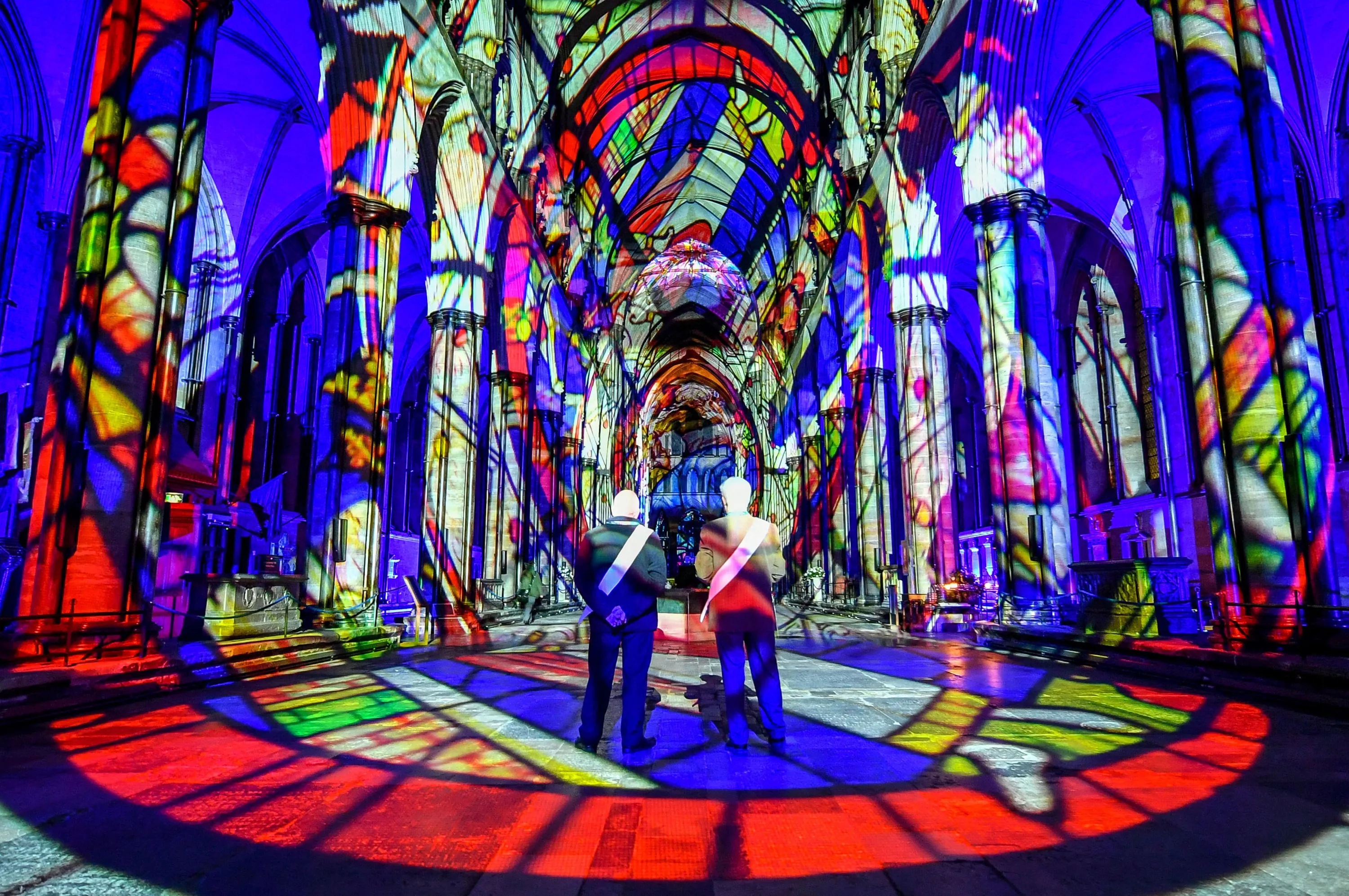Ushers admire the interior of Salisbury Cathedral on February 18, 2020, where a light and sound art installation, titled Sarum Lights, is marking the Cathedral's 800th anniversary in 2020, by lighting the inside and outside along with music. (Photo by Ben Birchall/PA Images via Getty Images)