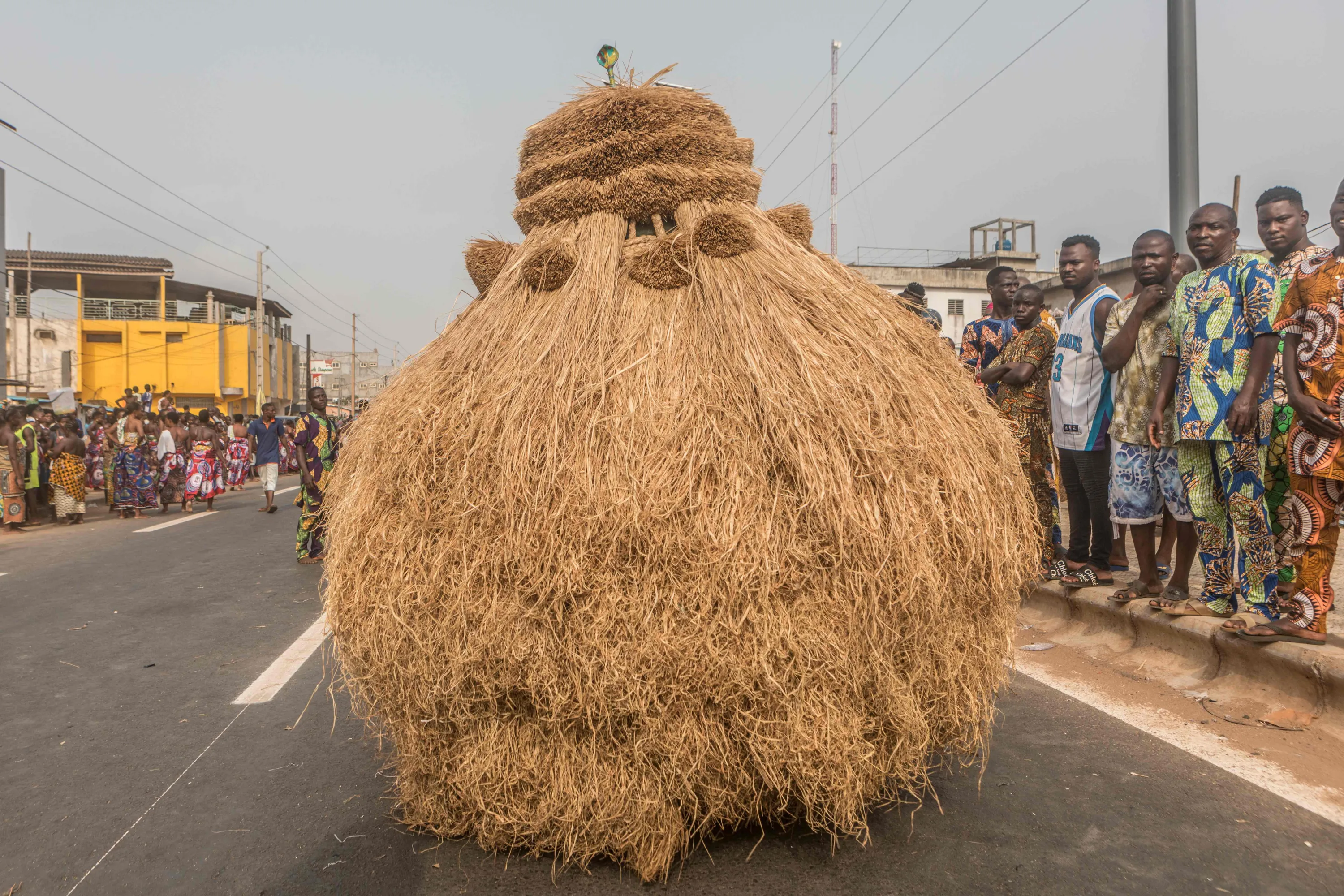 Voodoo devotees dressed in costume parade on the main boulevard of Porto-novo, in Benin on January 11, 2020. The 4th edition of the Porto Novo International Festival (FIP) takes place from January 4 to 12, 2020 in Porto-Novo. 1,200 cultural and ritual masks from several African countries paraded for a grand parade during the 4th edition of the International Festival of Culture, Arts and Vodun Civilization scheduled to date in Porto-Novo. (Photo by Yanick Folly/AFP Photo)