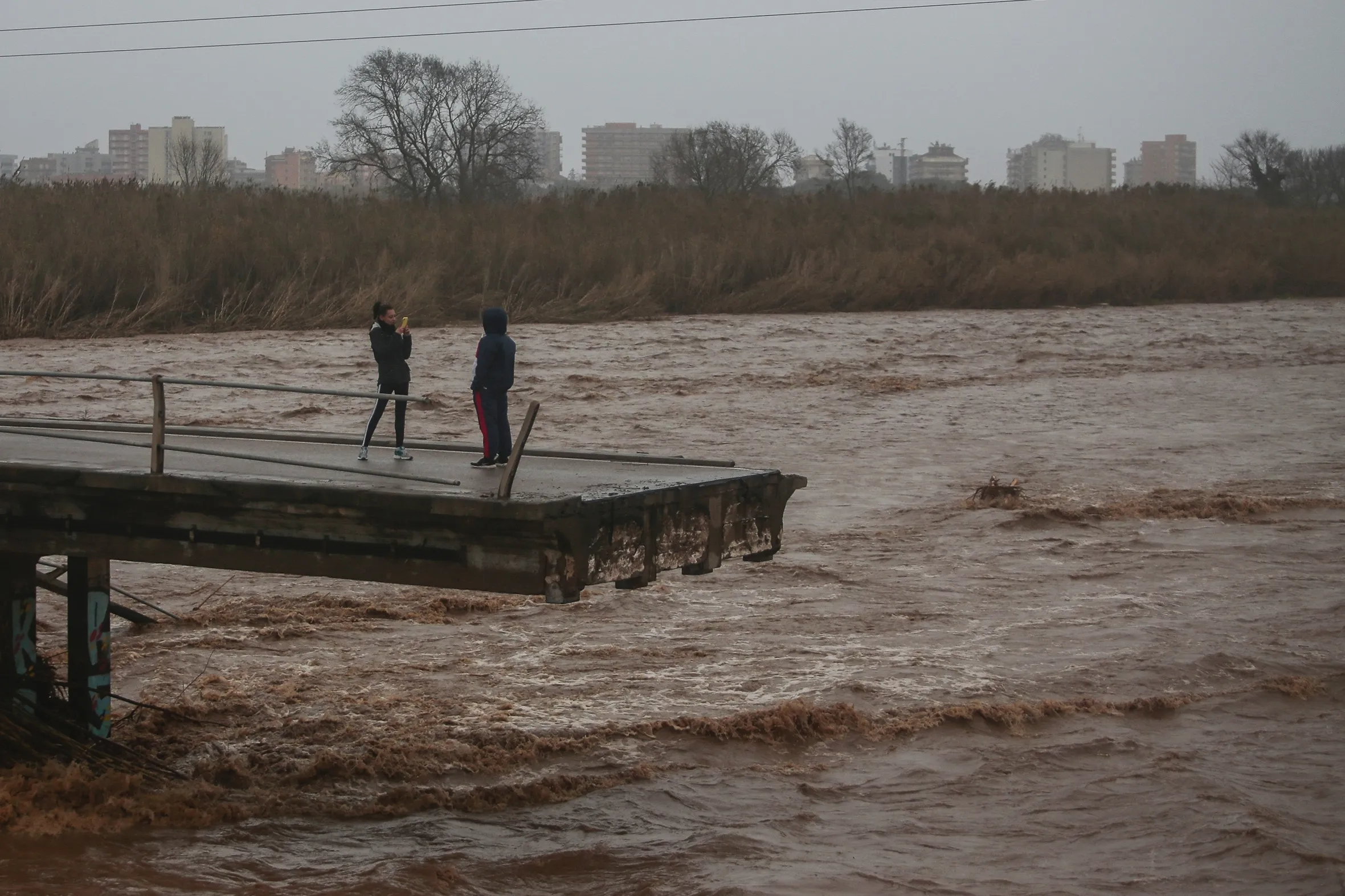 Two people take snapshots atop of a collapsed bridge in Malgrat, near Barcelona, Spain, Wednesday, January 22, 2020. Since Sunday the storm has hit mostly eastern areas of Spain with hail, heavy snow and high winds, while huge waves smashed into towns on the Mediterranean coast and nearby islands of Mallorca and Menorca. (Photo by Joan Mateu/AP Photo)