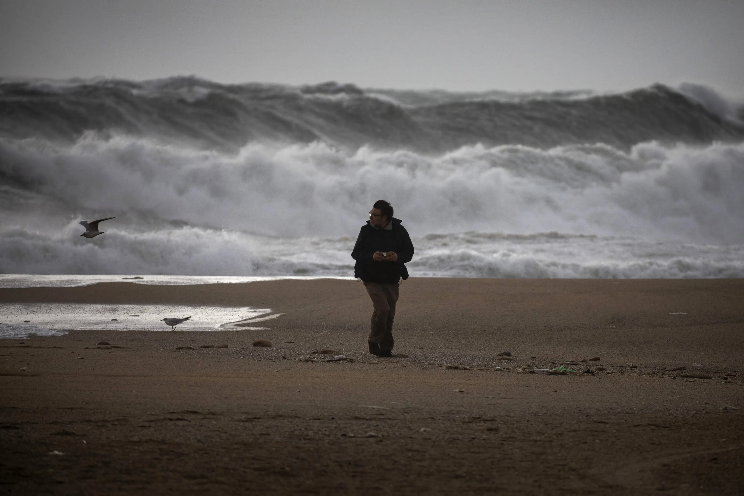 A man walks at the beach during strong winds in Barcelona, Spain, Monday, January 20, 2020. Two people have died as storms carrying heavy snowfalls and gale-force winds lashed many parts of Spain on Monday. The storm has forced the closure of Alicante airport and some 30 roads in eastern region. Six provinces are on top alert. (Photo by Emilio Morenatti/AP Photo)