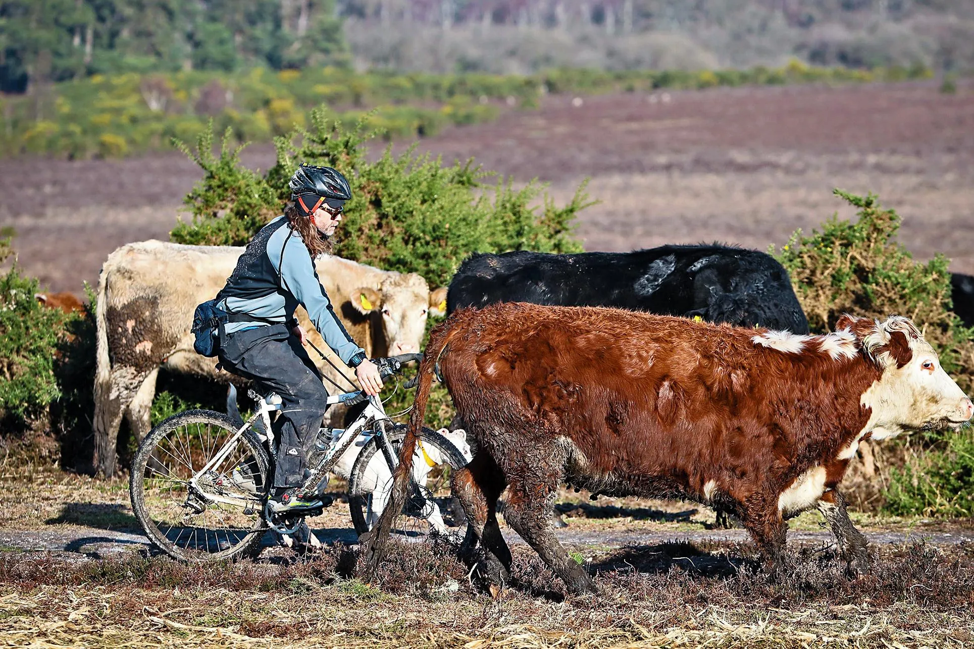 A cyclist carefully navigates past grazing cattle near Lyndhurst on a cold, sunny morning in the New Forest, southern England yesterday, on February 3, 2020. (Photo by Stuart Martin/Alamy Live News)