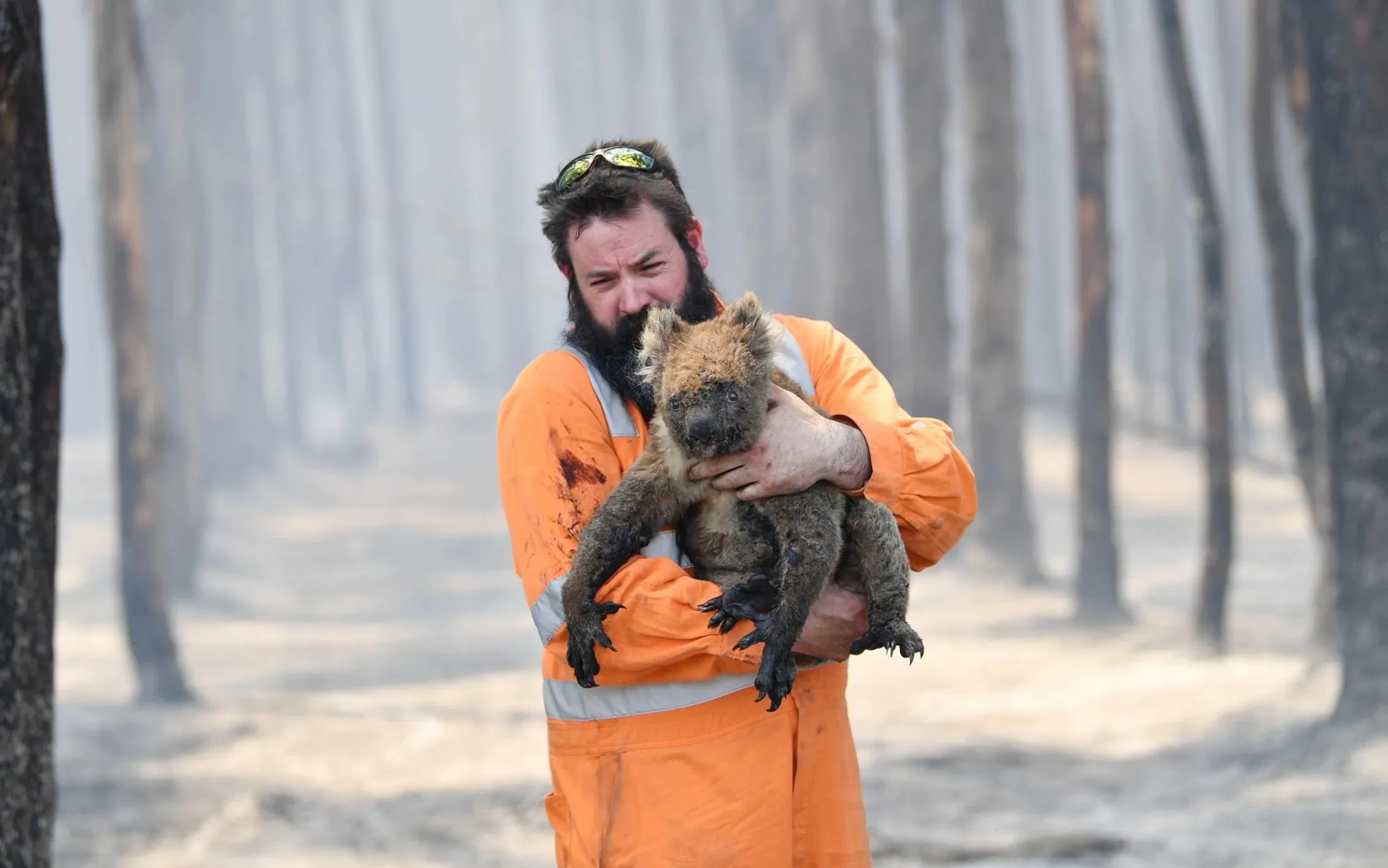 Adelaide wildlife rescuer Simon Adamczyk holds a koala he rescued at a burning forest near Cape Borda on Kangaroo Island, Australia, 07 January 2020. A convoy of Army vehicles, transporting up to 100 Army Reservists and self-sustainment supplies, is on Kangaroo Island as part of Operation Bushfire Assist at the request of the South Australian Government. (Photo by David Mariuz/EPA/EFE)