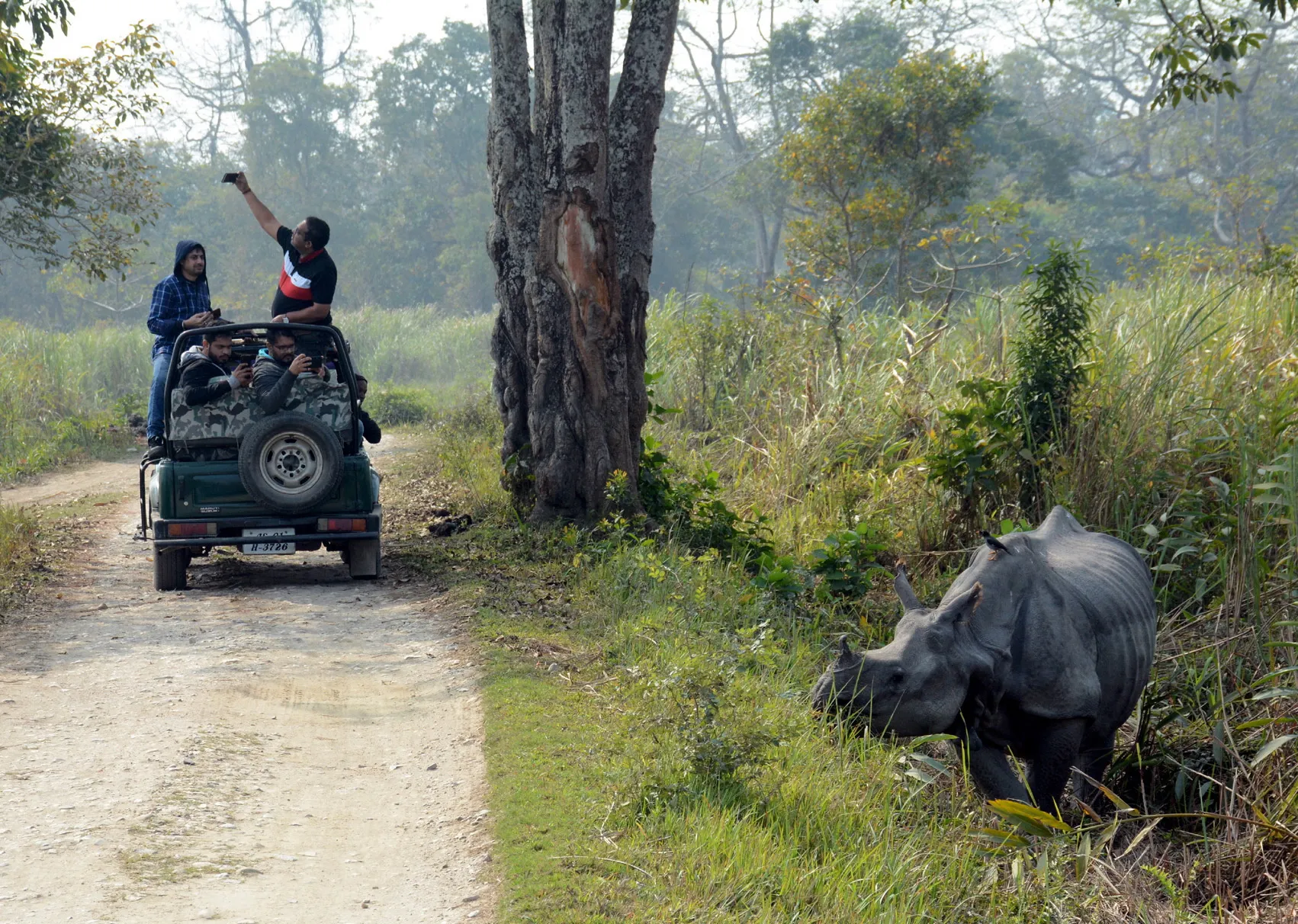 A one-horned rhinoceros roams as tourists take pictures, inside the Kaziranga National Park in Nowagaon district of Assam, India, 05 February 2020. According to officials, Kaziranga National Park, a UNESCO World Heritage Site which hosts two-thirds of the world's great one-horned rhinoceroses, is also home to large breeding populations of tigers, elephants, wild water buffalos, wild boars and swamp deer. (Photo by EPA/EFE/Stringer)