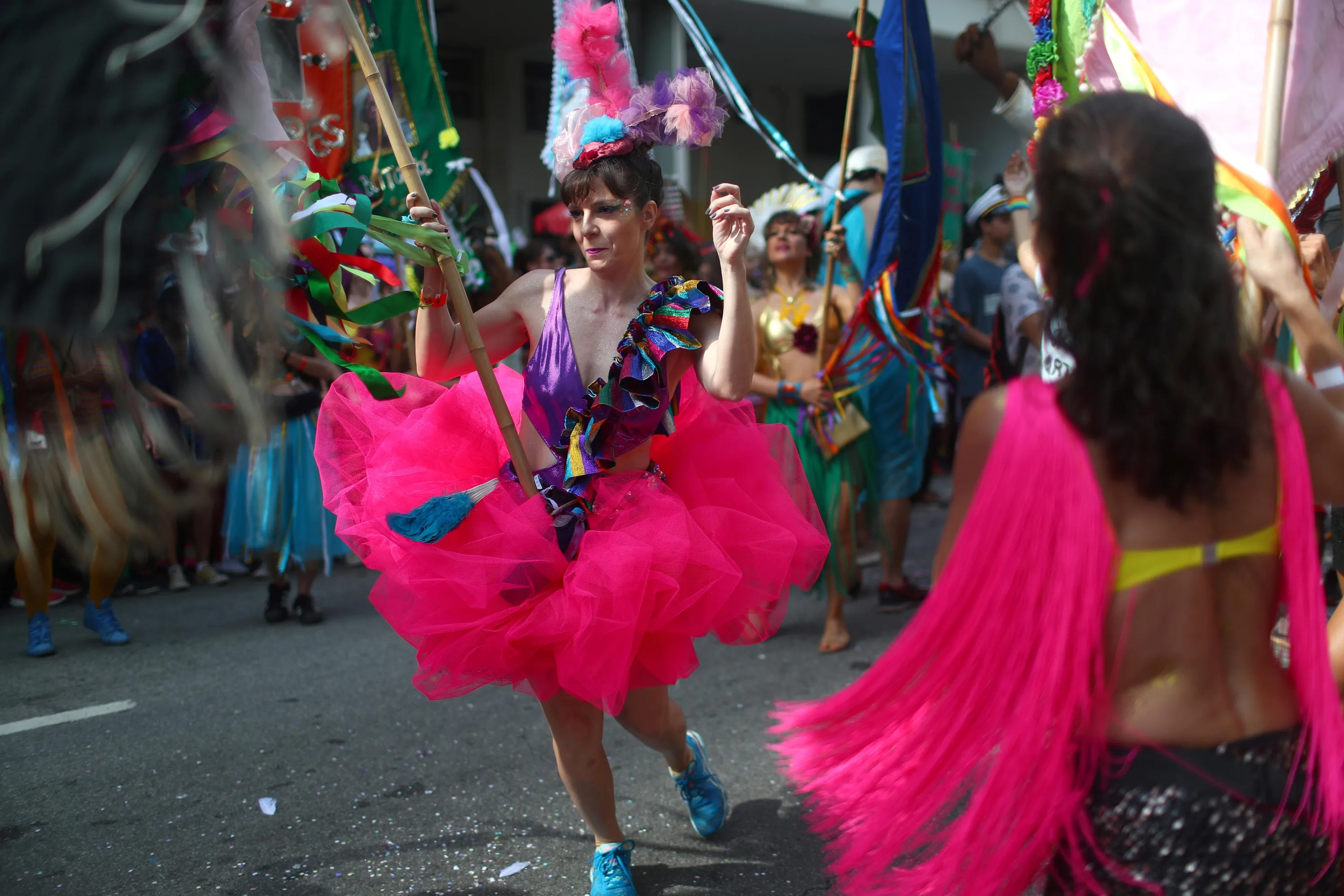 A reveller dances with a bamboo staff with decorations during the annual block party known as “Cordao de Boitata”, during Carnival festivities in Rio de Janeiro, Brazil on February 16, 2020. (Photo by Pilar Olivares/Reuters)