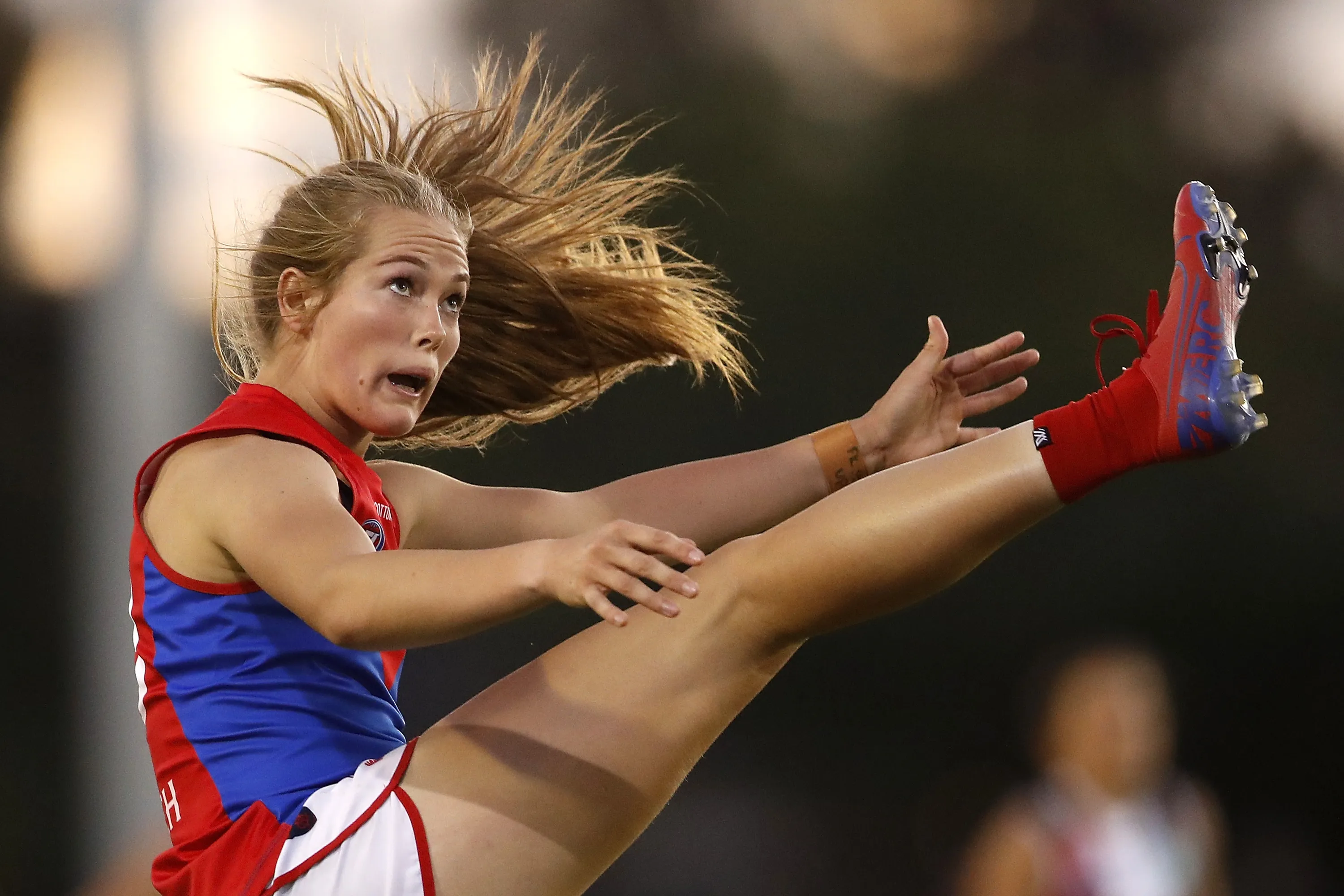 Eden Zanker of the Demons kicks the ball during the 2020 AFLW Round 03 match between the St Kilda Saints and the Melbourne Demons at RSEA Park on February 21, 2020 in Melbourne, Australia. (Photo by Dylan Burns/AFL Photos via Getty Images)