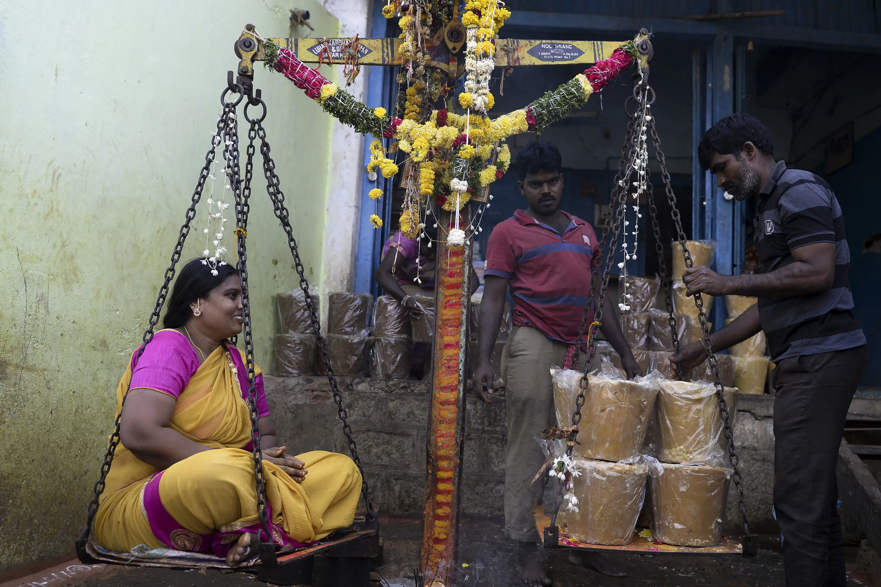 A Hindu devotee sits on a scale to buy his weight in jaggery as an offering to goddesses during Sammakka Saralamma Jatara festival, in Hyderabad on February 5, 2020. (Photo by Noah Seelam/AFP Photo)