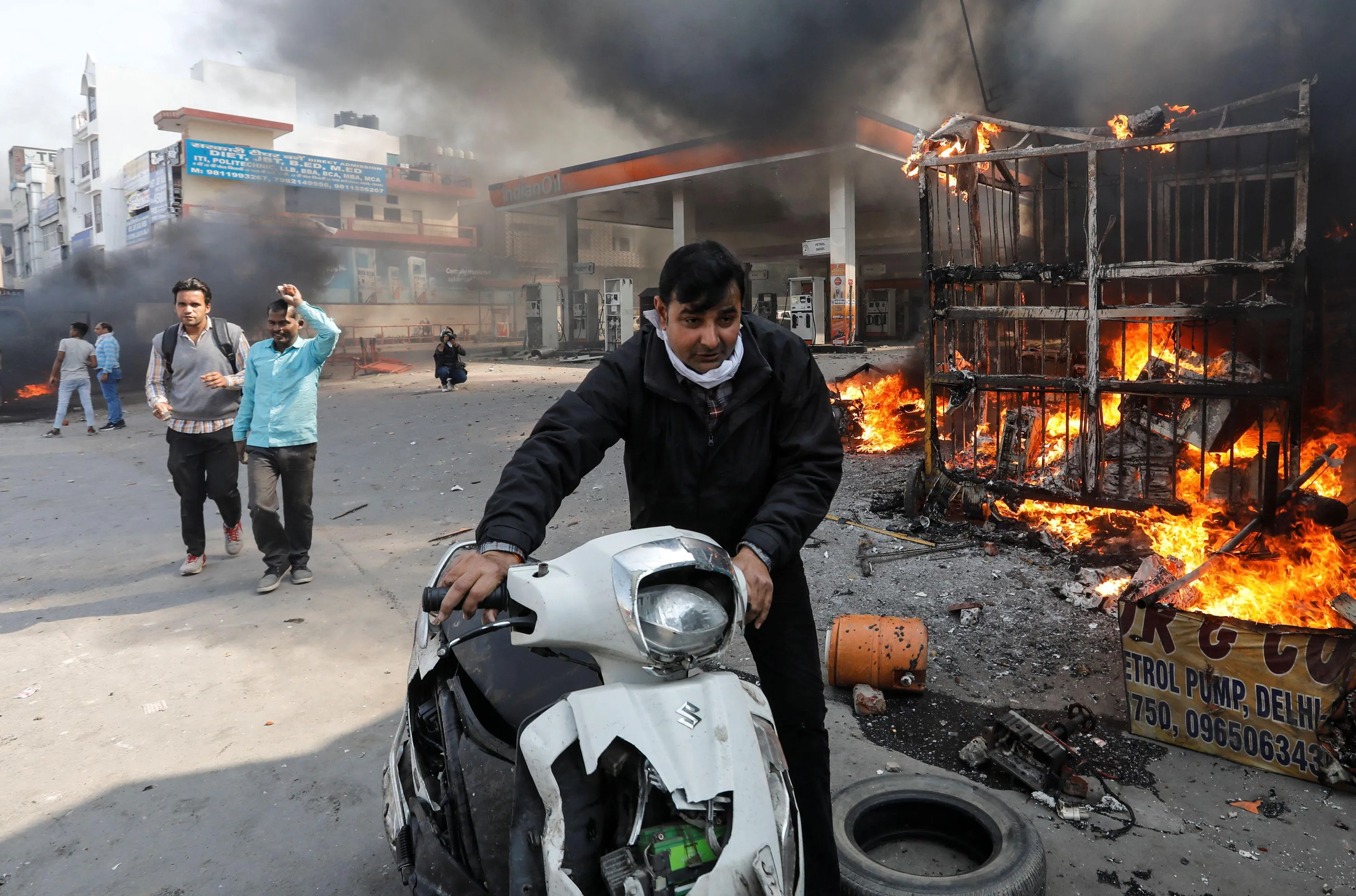 A man pushes his damaged scooter past a burning petrol pump during a clash between people supporting a new citizenship law and those opposing it, in New Delhi India, February 24, 2020. (Photo by Danish Siddiqui/Reuters)