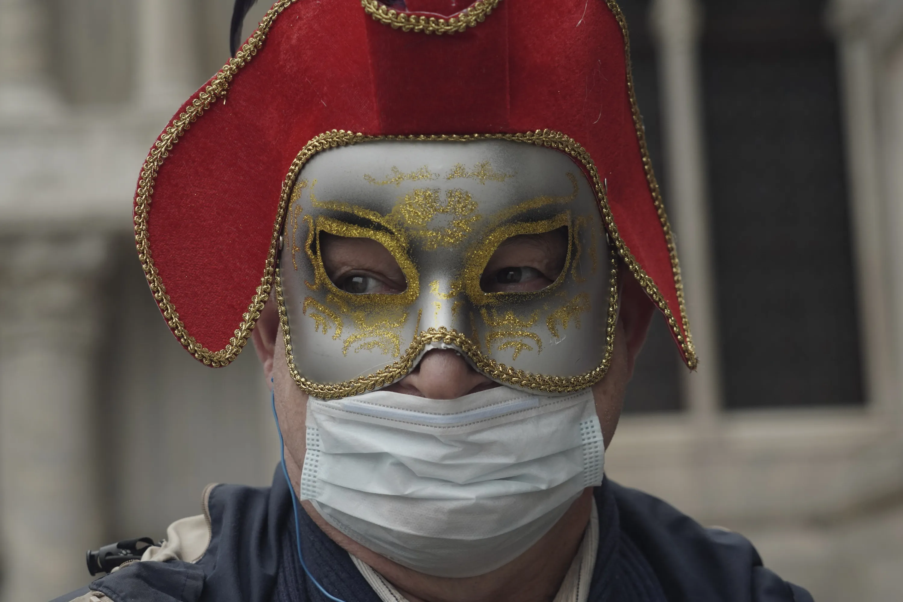 A Russian tourist dons both a carnival mask and a protective face mask as he visits St. Mark's square Venice, Italy, Tuesday, February 25, 2020. (Photo by Renata Brito/AP Photo)