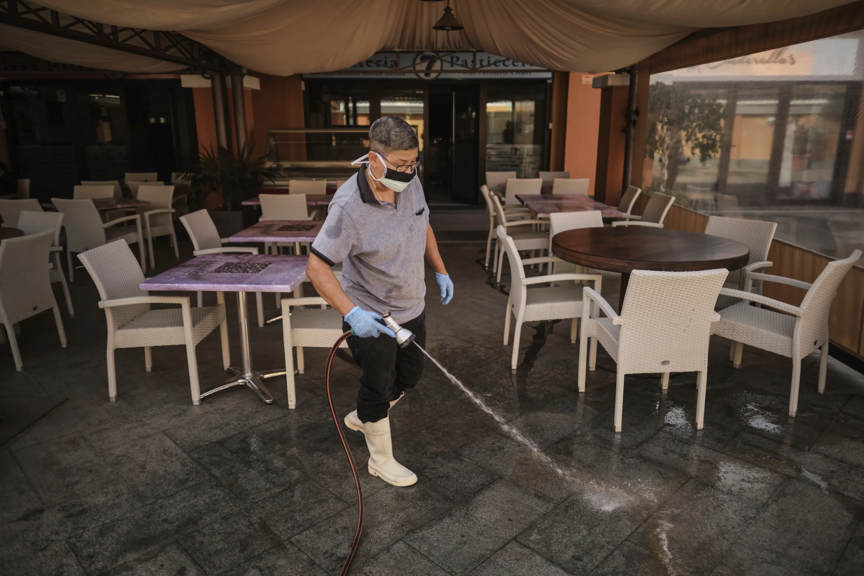 A staffer wearing a mask cleans the terrace of a shopping mall in La Caleta, in the Canary Island of Tenerife, Spain, Wednesday, February 26, 2020. Worries over the ever-expanding economic fallout of the COVID-19 crisis multiplied, with factories idled, trade routes frozen and tourism crippled, while a growing list of countries braced for the illness to claim new territory. Even the Olympics, five months away, wasn't far enough off to keep people from wondering if it would go on as planned. (Photo by AP Photo/Stringer)