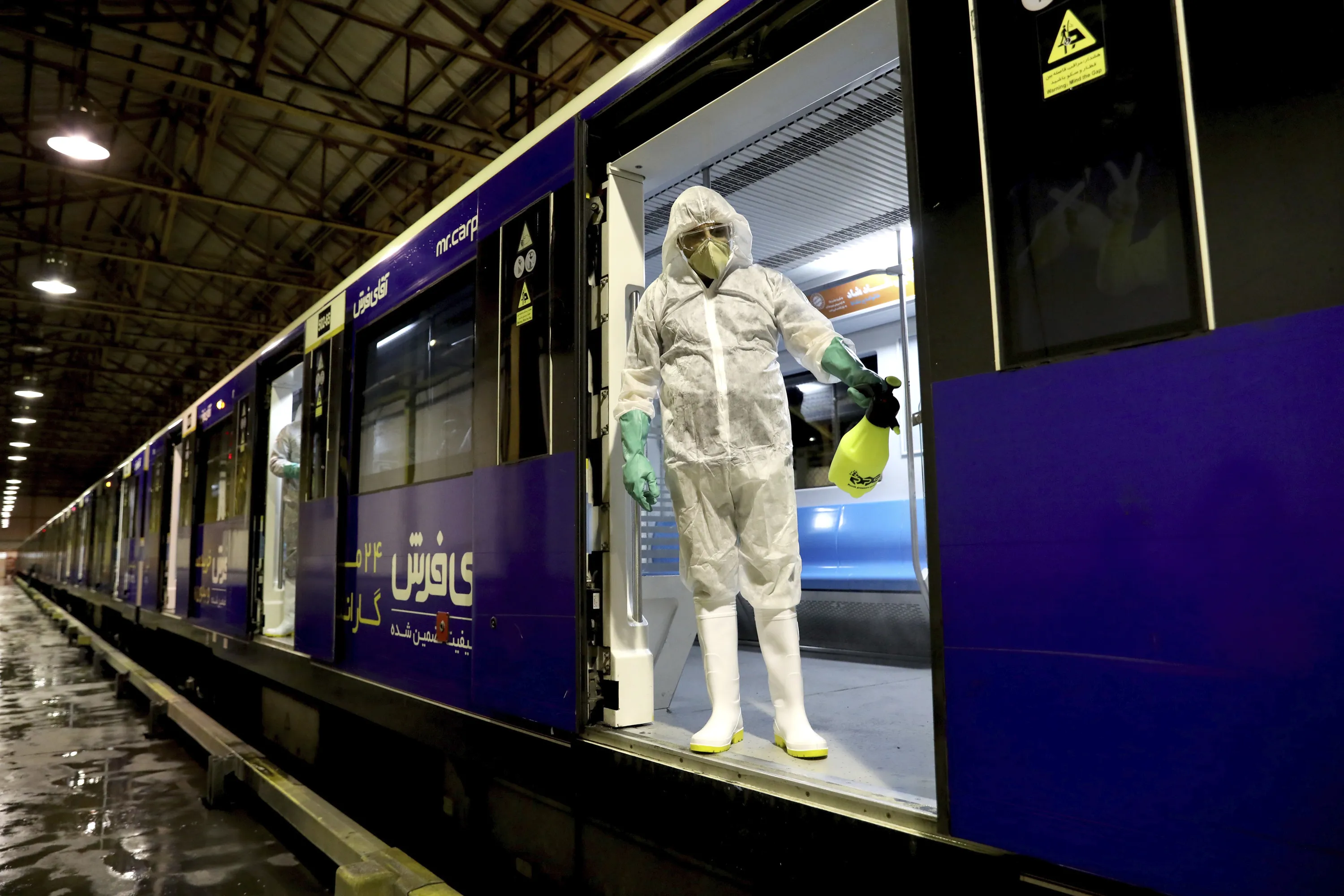 A worker disinfects subway trains against coronavirus in Tehran, Iran, in the early morning of Wednesday, February 26, 2020. Iran's government said Tuesday that more than a dozen people had died nationwide from the new coronavirus, rejecting claims of a much higher death toll of 50 by a lawmaker from the city of Qom that has been at the epicenter of the virus in the country. (Photo by Ebrahim Noroozi/AP Photo)