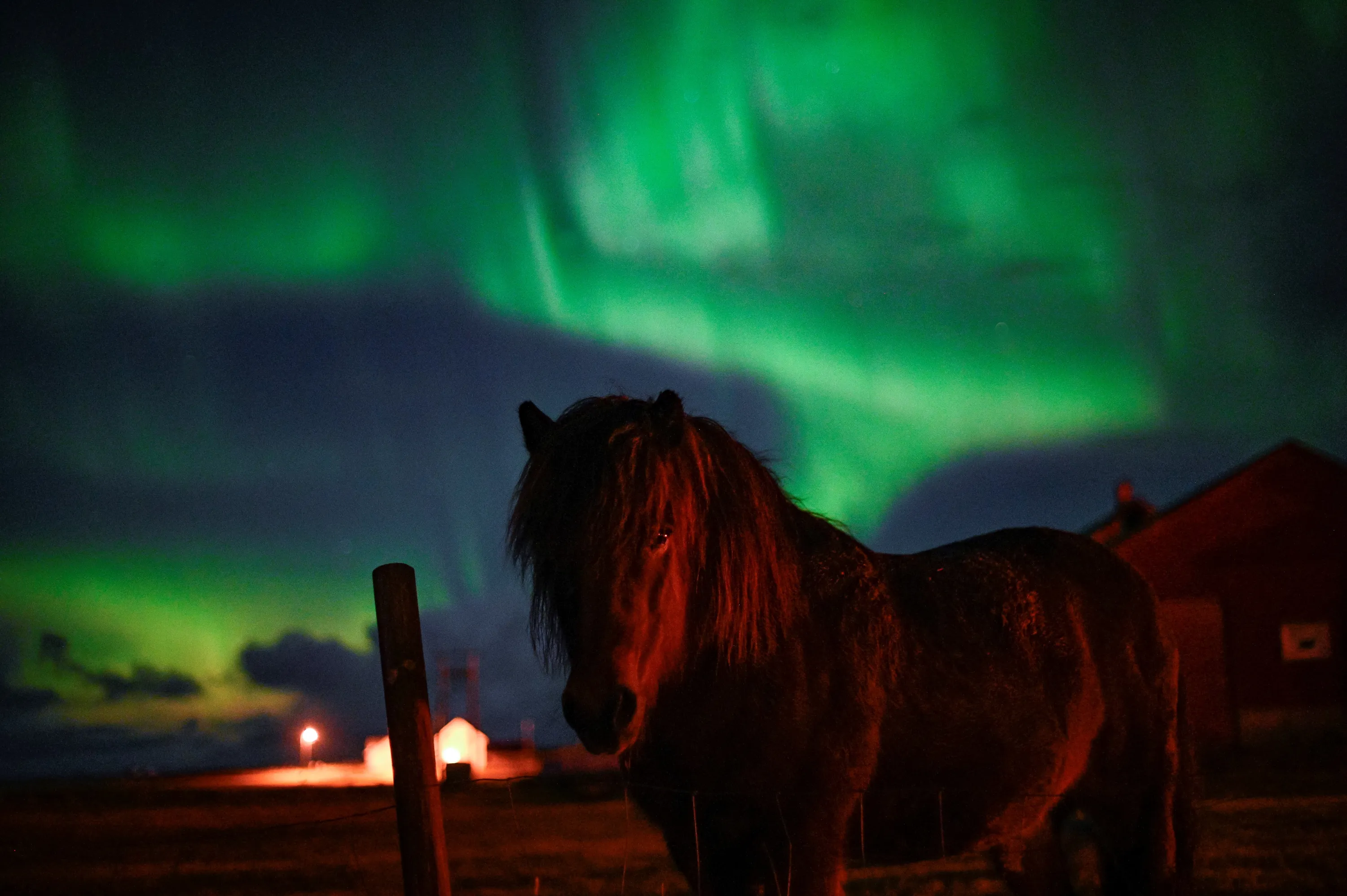 A poney stands under northern lights on September 30, 2018, in Unstad, Northern Norway. (Photo by Olivier Morin/AFP Photo)