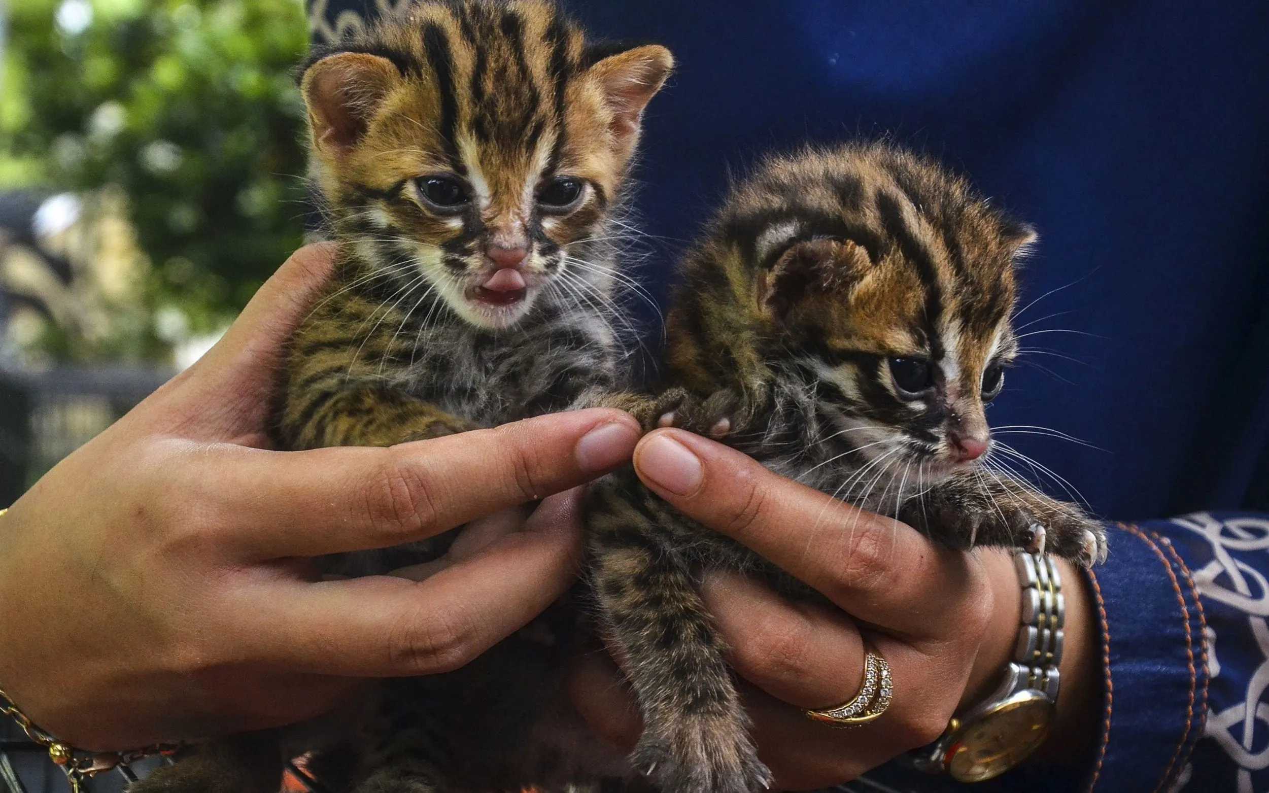 An Indonesian official holds two leopard cats at the office of Indonesia's Natural Resources Conservation Agency (BKSDA) in Pekanbaru, Riau province on February 18, 2020. The cats were caught by a local resident at a nearby farm and will be released into the wild following observation by the agency. (Photo by Wahyudi/AFP Photo)