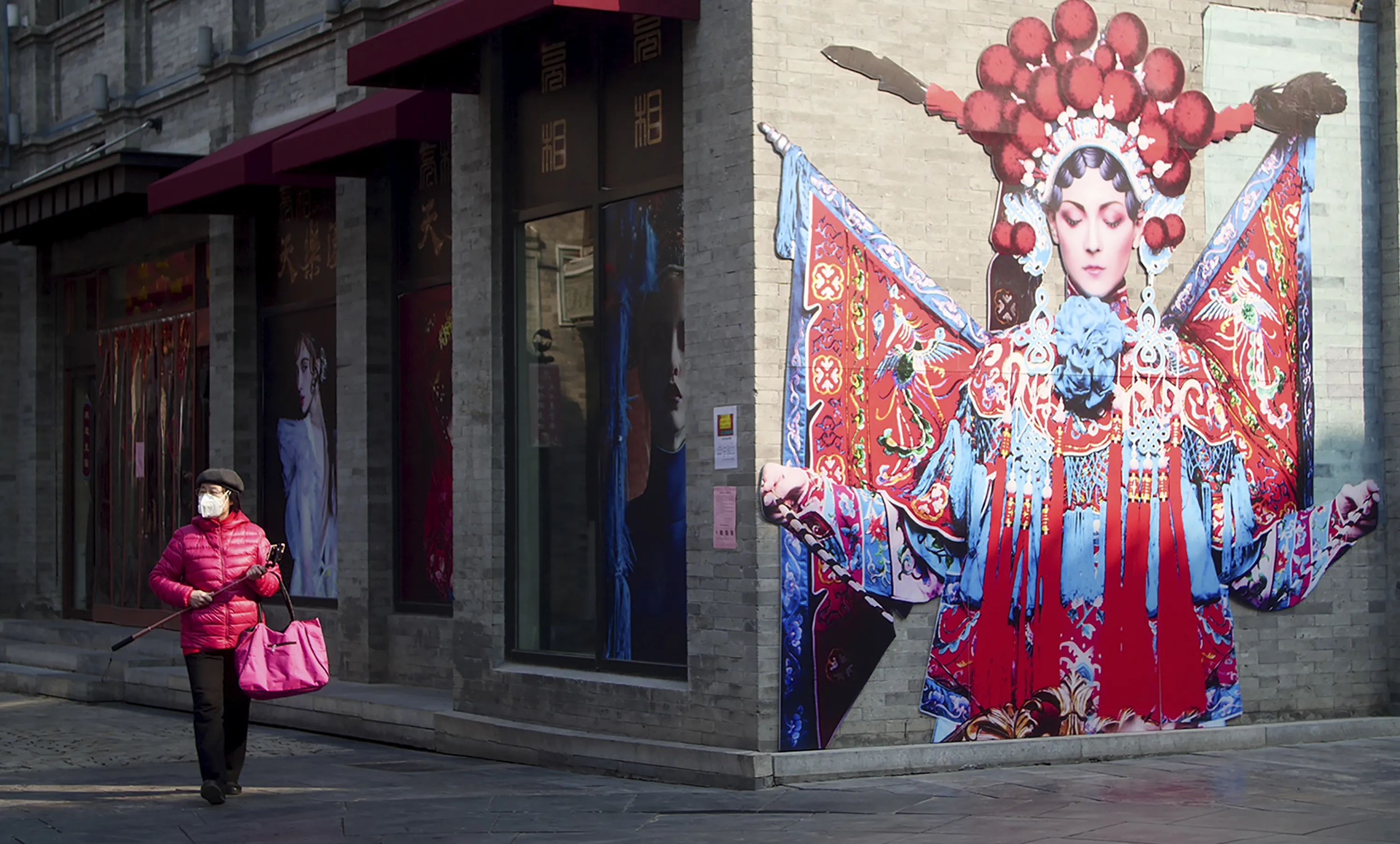 A woman wears a mask as she strolls through a quiet retail street in Beijing, China on Wednesday, February 19, 2020. (Photo by Sam McNeil/AP Photo)