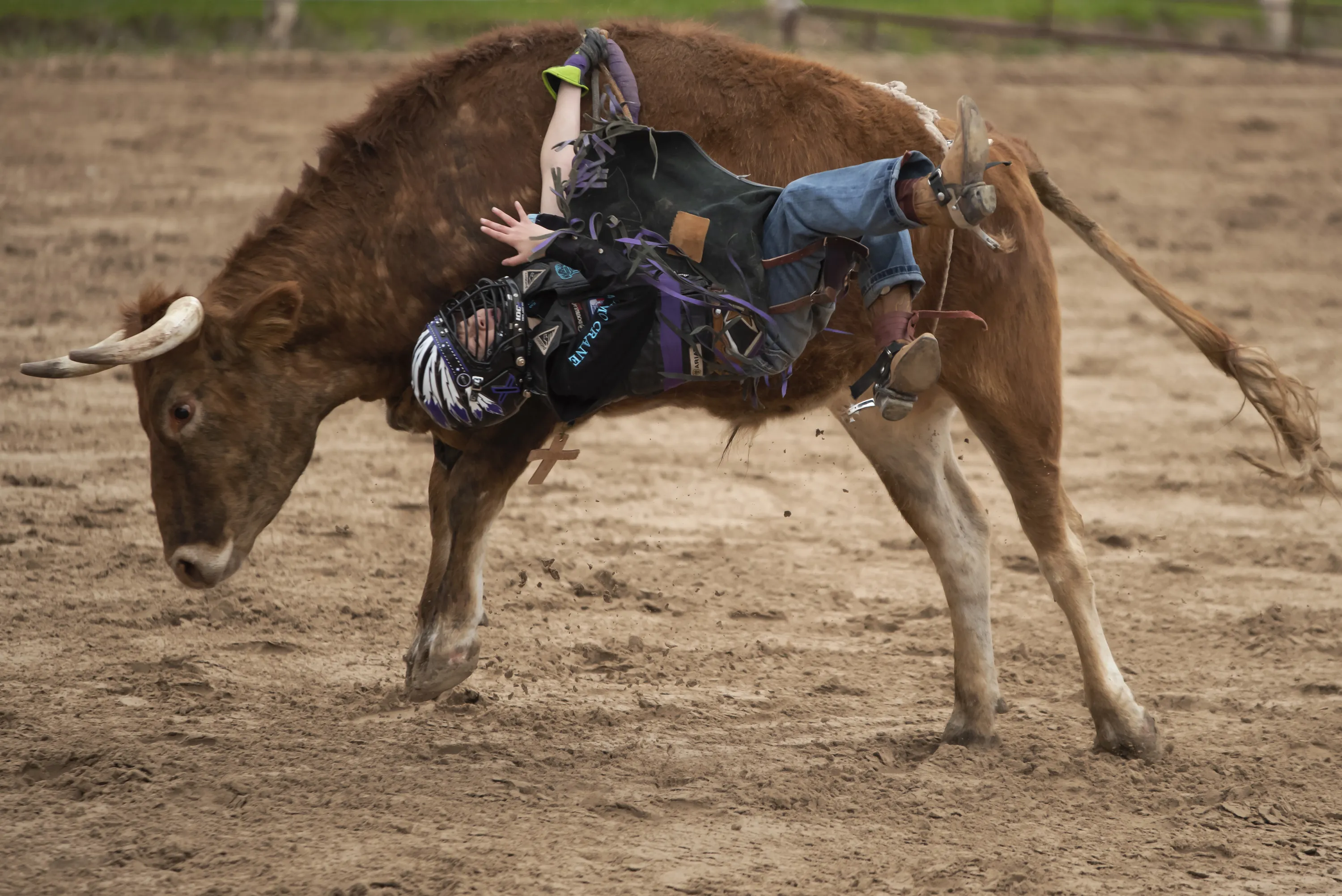 Sterling Huitron, 10, gets bucked off a mini bull during the Cowboy Mardi Gras Bull Riding and Mini Bull Riding Competition in Bandera, Texas on February 15, 2020. (Photo by Mark Felix/AFP Photo)