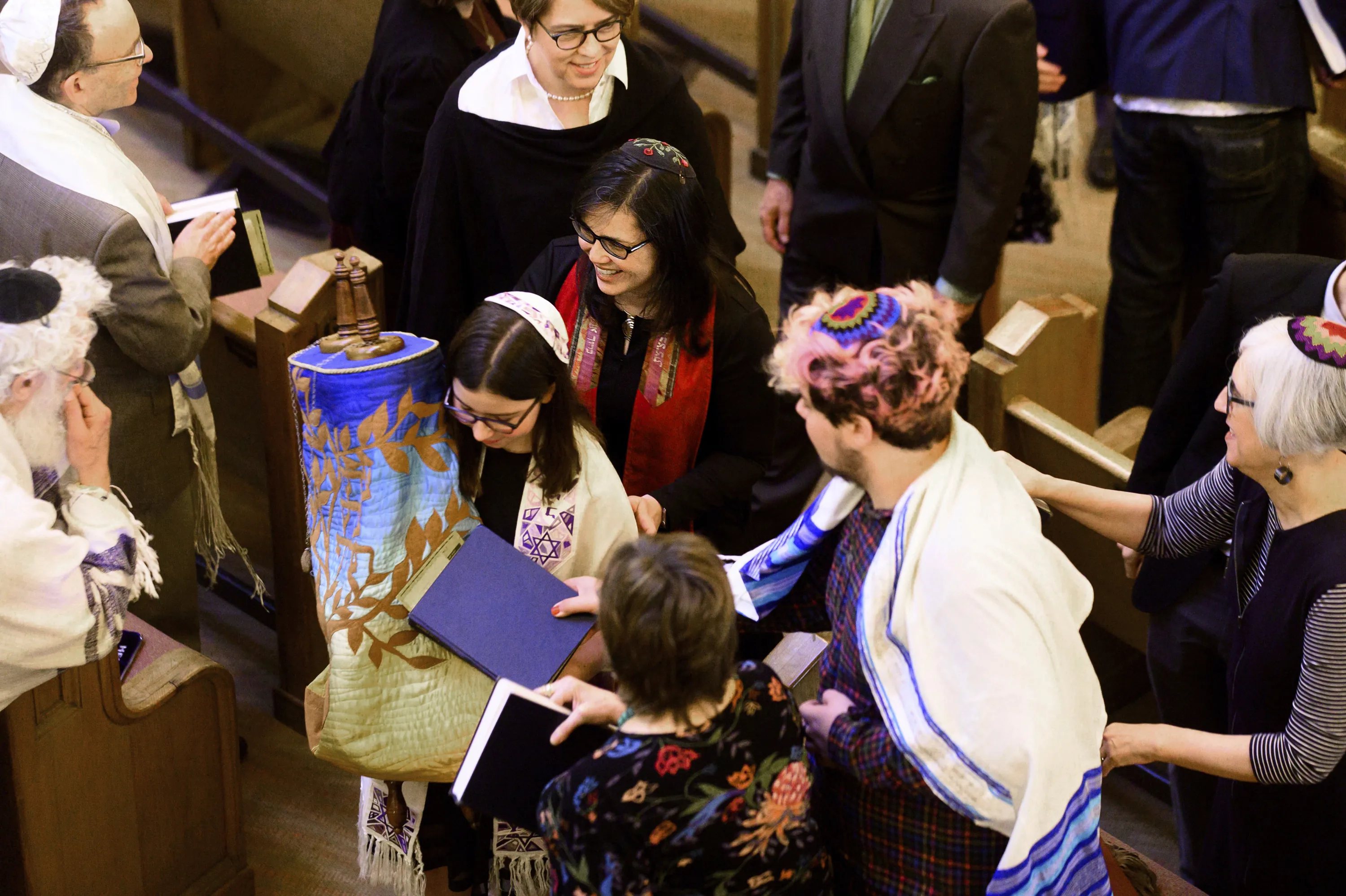 In this Saturday, February 1, 2020, photo, Rabbi Jacqueline Mates-Muchin follows Hanna Raskin as she carries a Torah scroll during her bat mitzvah at Temple Sinai in Oakland, Calif. Mates-Muchin says there’s extra worry as she feels obliged to be constantly mindful of her congregation’s safety. (Photo by Noah Berger/AP Photo)