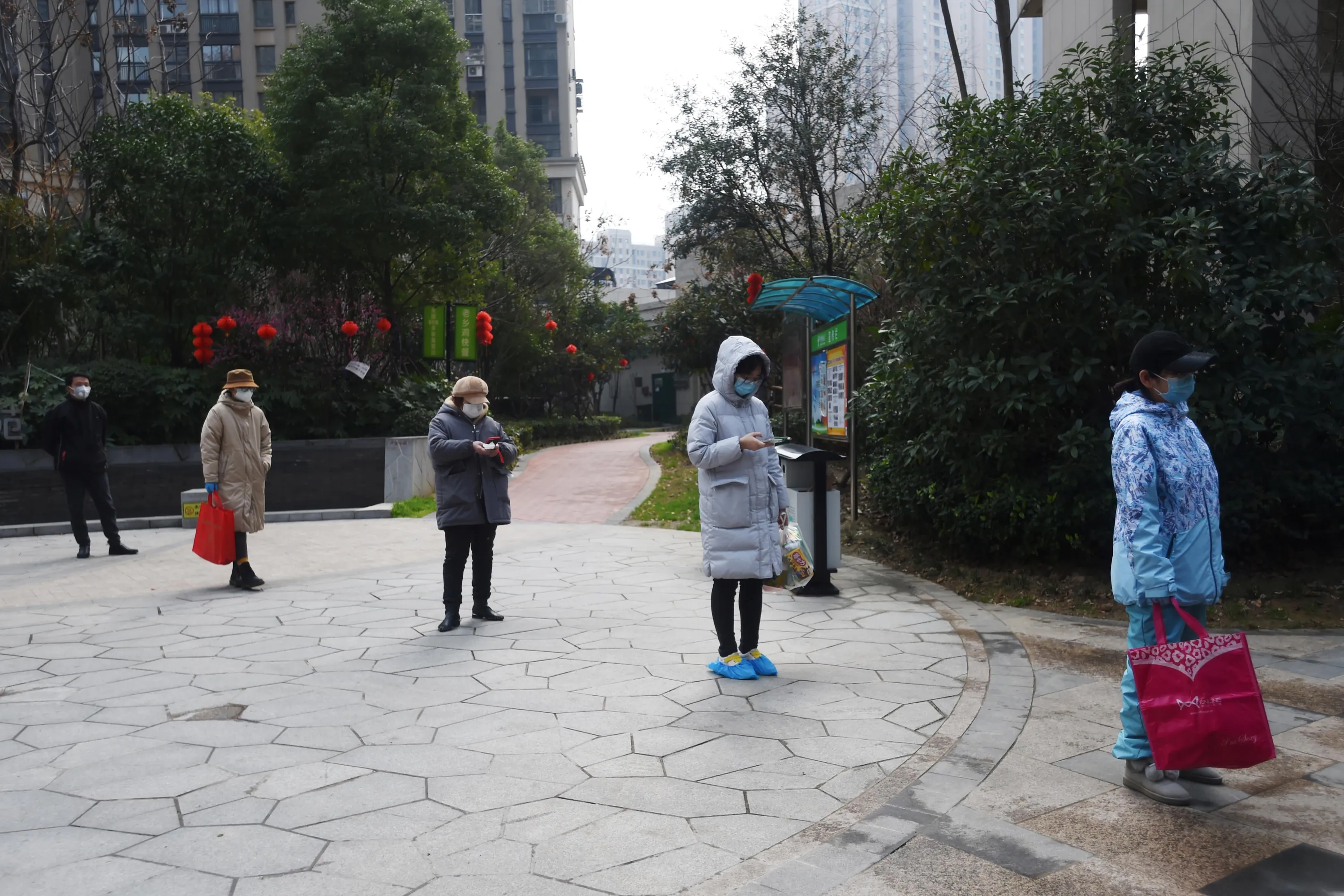 Residents line up to collect necessities purchased through group orders at a residential compound in Wuhan, February 21, 2020. (Photo by Reuters/China Stringer Network)