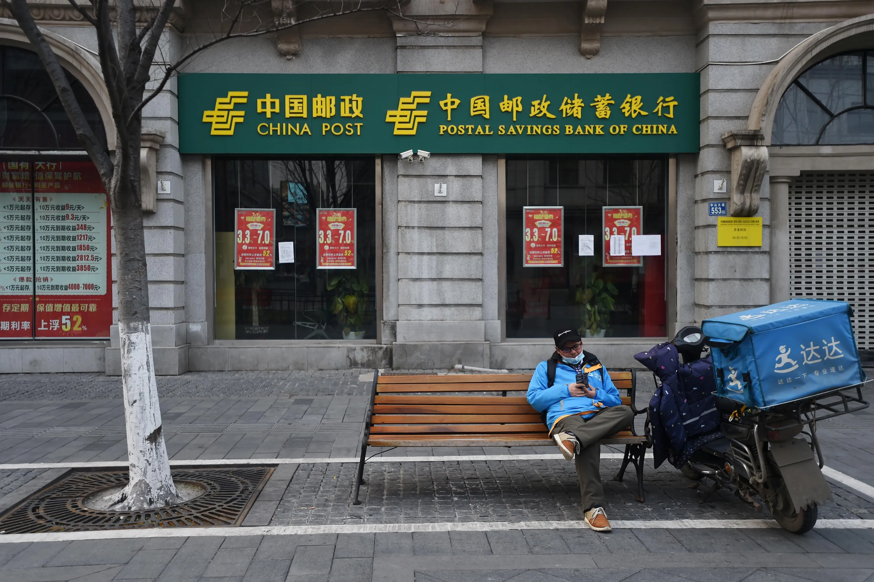 A delivery worker checks his mobile phone outside a Postal Savings Bank of China branch in Wuhan, February 25, 2020. (Photo by Reuters/China Stringer Network)