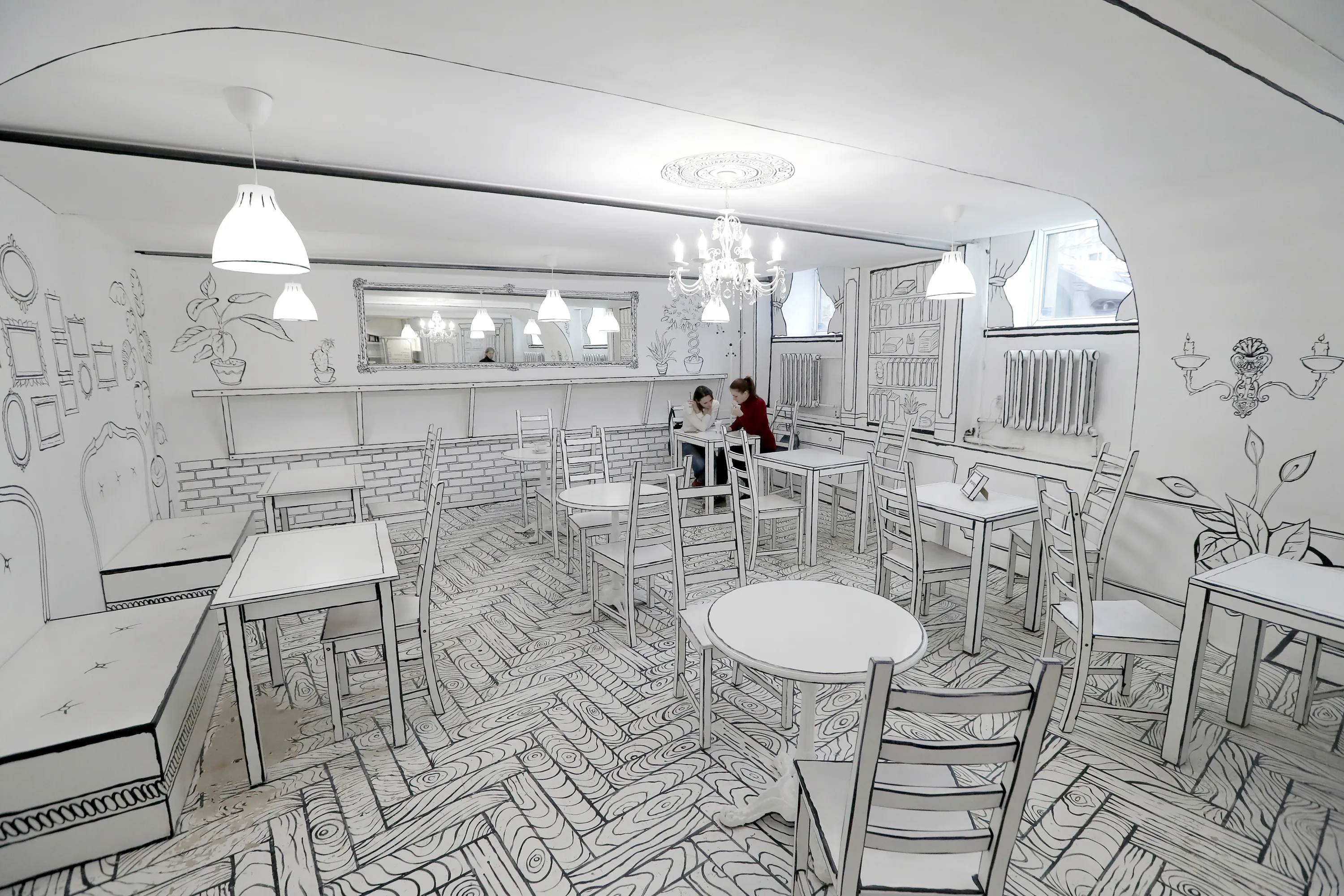 People visit the newly opened “B&W cafe” in the center of St. Petersburg, Russia, 19 February 2020. The interior of the first black-and-white coffee shop to open in Russia looks drawn. This effect was achieved by the creators using white paint and black lines. All repairs and design were done by hand in 35 days. (Photo by Anatoly Maltsev/EPA/EFE)