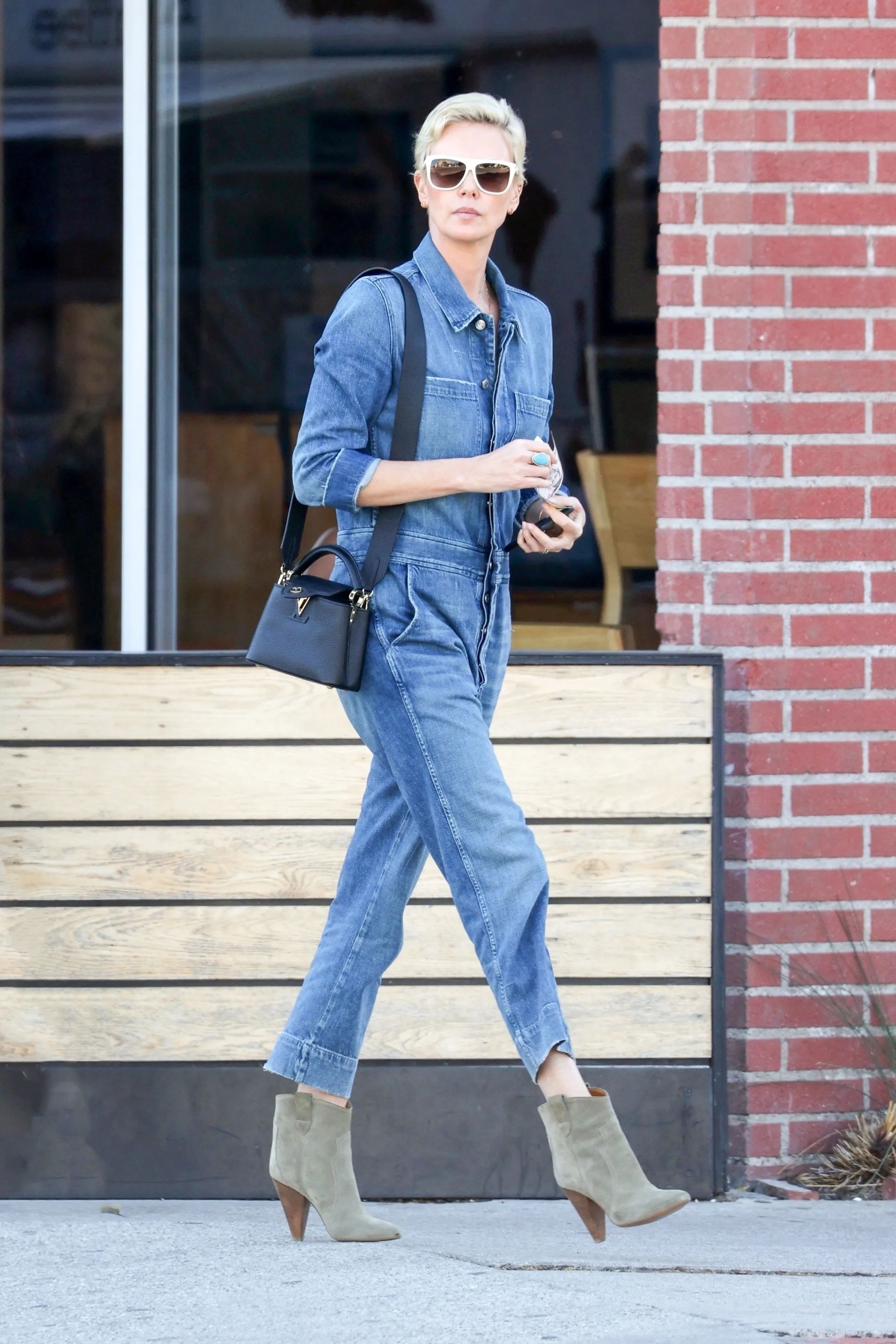 Charlize Theron rocks a denim jumpsuit for lunch at Sugarfish in Los Angeles, CA. on March 3, 2020. The actress pairs a pair of suede booties with her look and completes the ensemble with black shades. (Photo by Backgrid USA)
