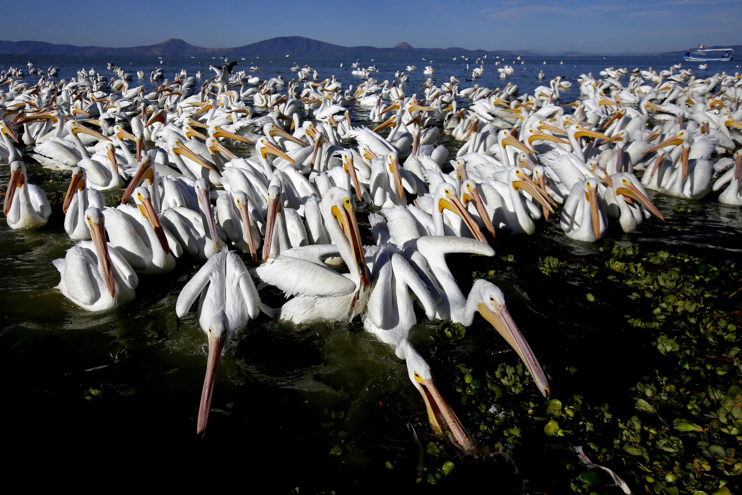 White pelicans, one of the largest birds from Canada and the United States, are seen at the shore of the Chapala lagoon in Cojumatlan, Mexico, on January 28, 2020. White pelicans travel thousands of kilometers migrating from the low temperatures of North America. (Photo by Ulises Ruiz/AFP Photo)