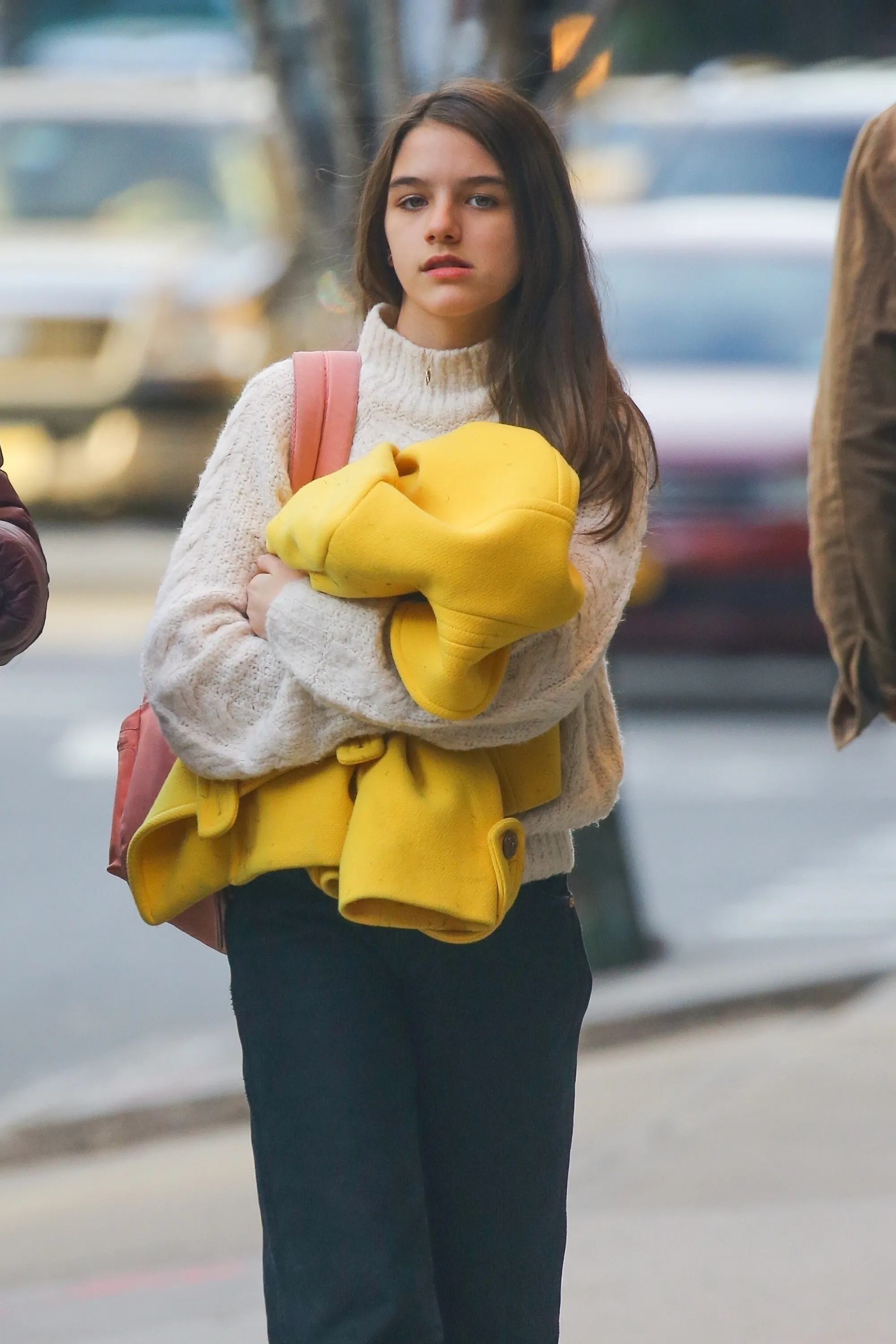 Suri Cruise walks down NYC on March 5, 2020 with her nursemaid by her side and the young daughter of Katie Holmes and Tom Cruise couldn't look more like her parents. (Photo by Backgrid USA)