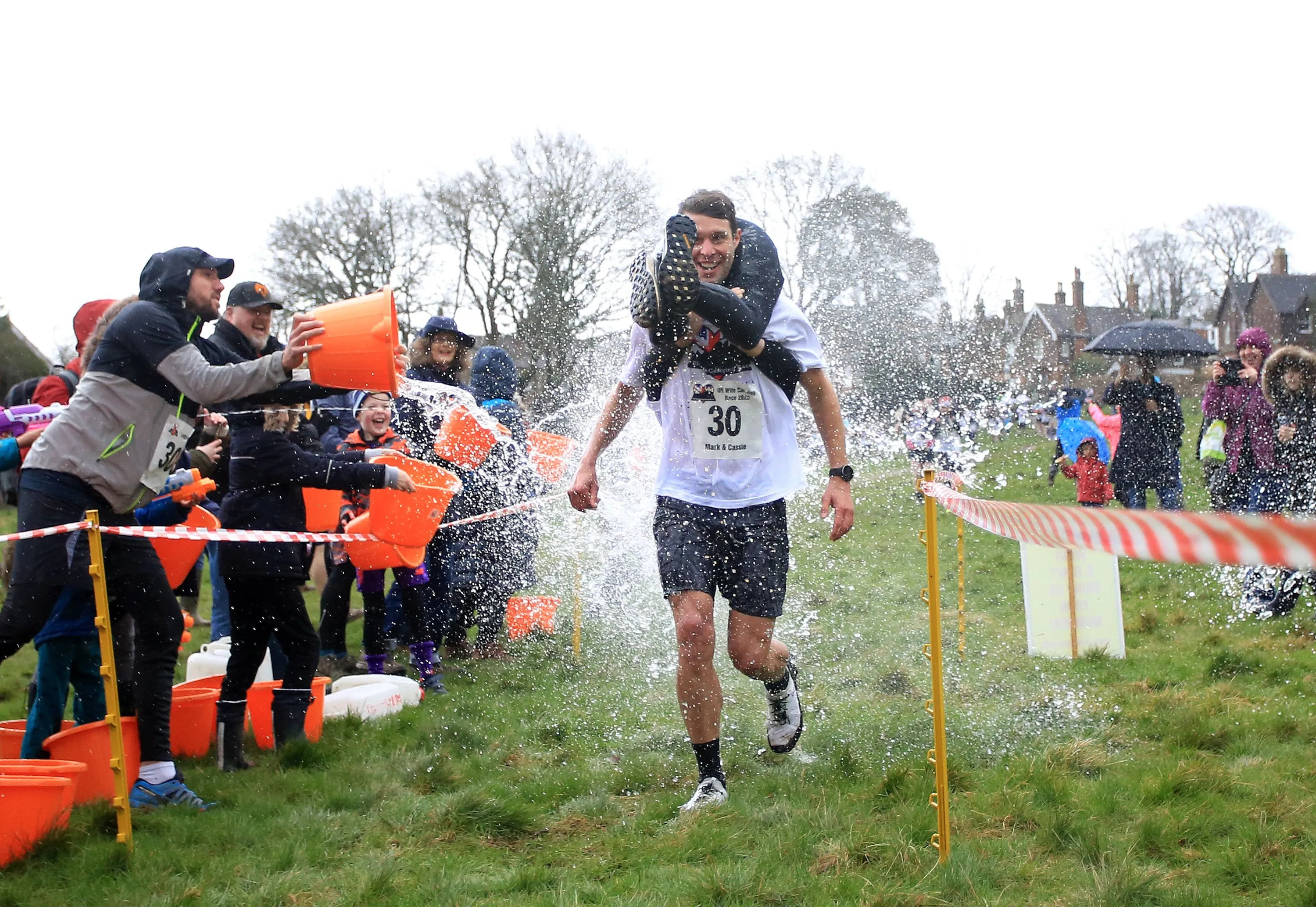 Mark Threlfall and Cassie Yates compete in the annual wife-carrying race in Dorking, England on March 1, 2020. (Photo by Rex Features/Shutterstock)
