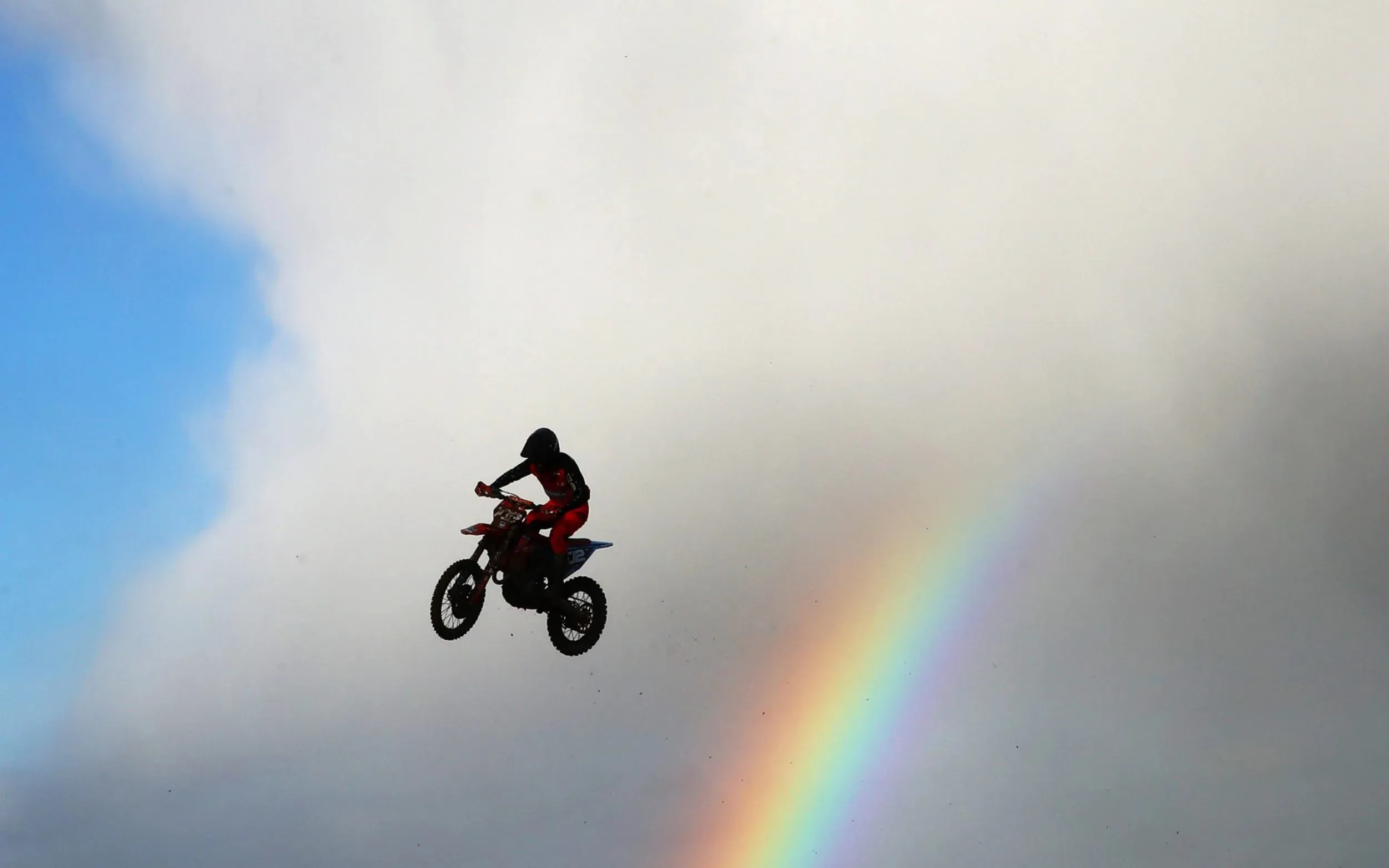 Richard Sikyna of Slovakia makes a jump as a rainbow forms behind in the MX2 race during the 2020 FIM MXGP World Championships on March 01, 2020 in Winchester, England. (Photo by Julian Finney/Getty Images)