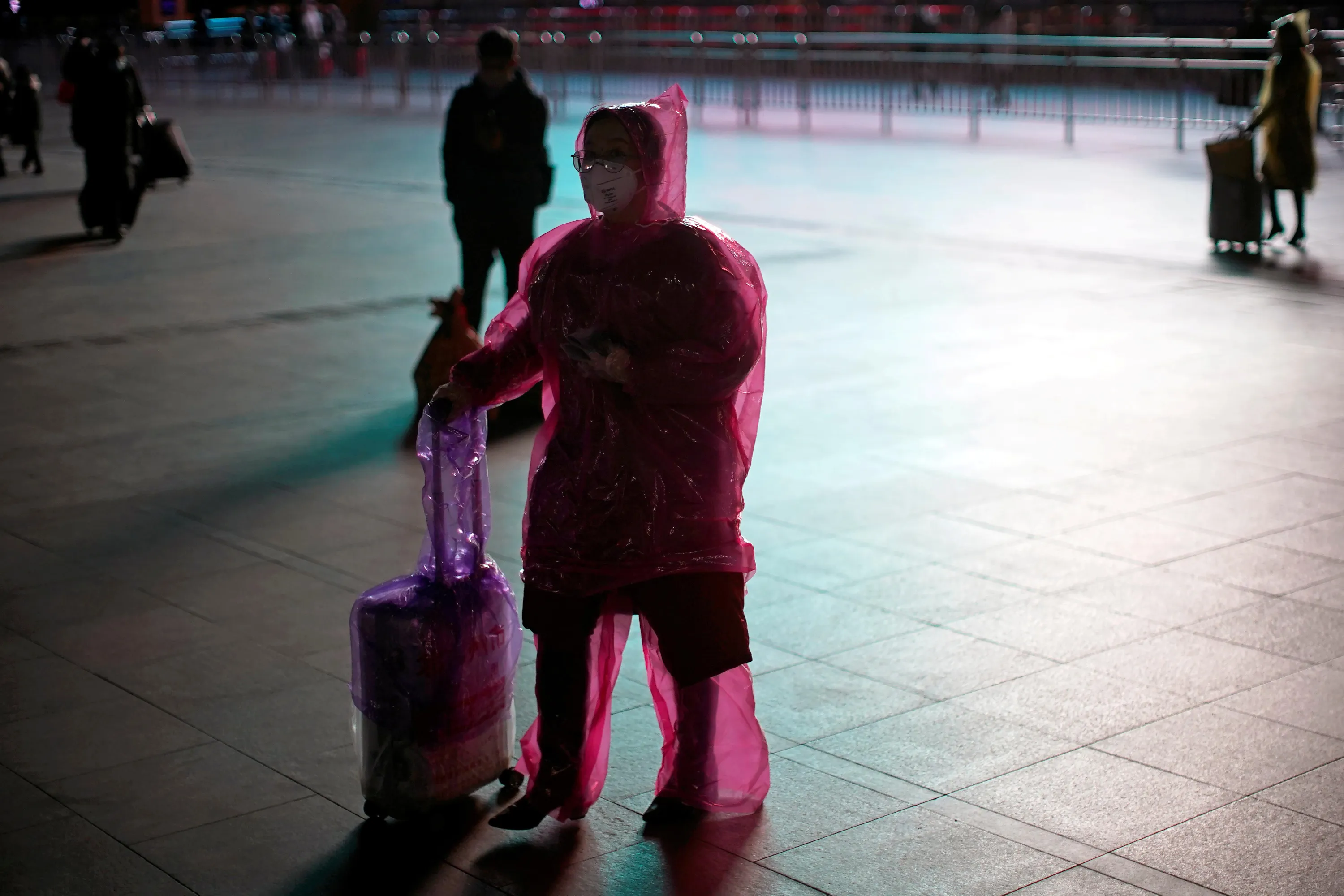 A woman wears a face mask and plastic raincoat as a protection from coronavirus at Shanghai railway station, in Shanghai, China on February 17, 2020. (Photo by Aly Song/Reuters)