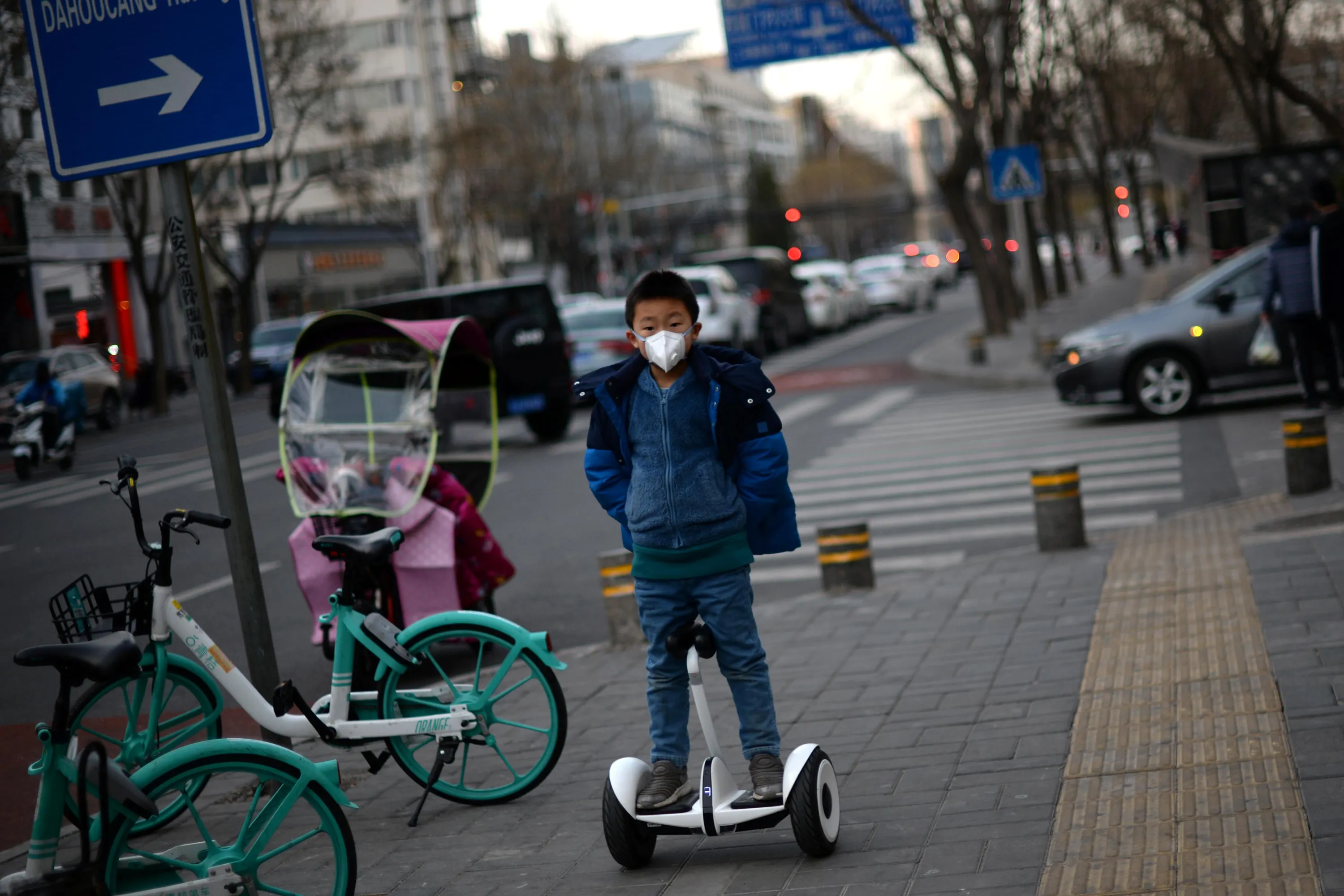 A child wearing a face mask rides a smart self-balancing scooter on a street, as the country is hit by an outbreak of the novel coronavirus, in Beijing, China on February 18, 2020. (Photo by Tingshu Wang/Reuters)