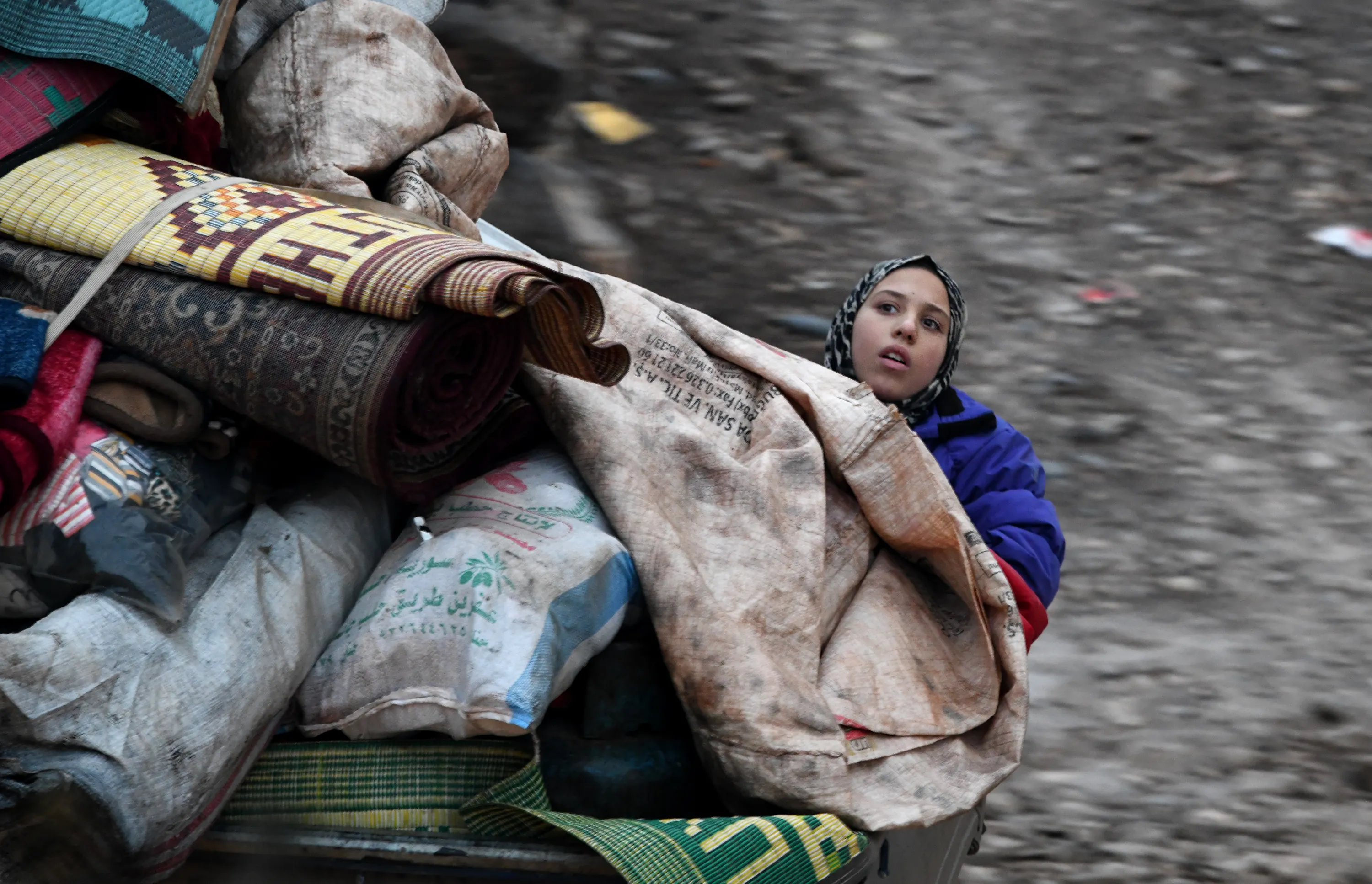 A Syrian girl rides in the back of a truck with belongings and furniture as people displaced from the south of Idlib province travelling in vehicles loaded with furniture and other belongings and fleeing from advancing government forces arrive at a camp for the internally displaced near Dayr Ballut, near the Turkish border in the rebel-held part of Aleppo province in the country's northwest on February 4, 2020. (Photo by Rami Al Sayed/AFP Photo)