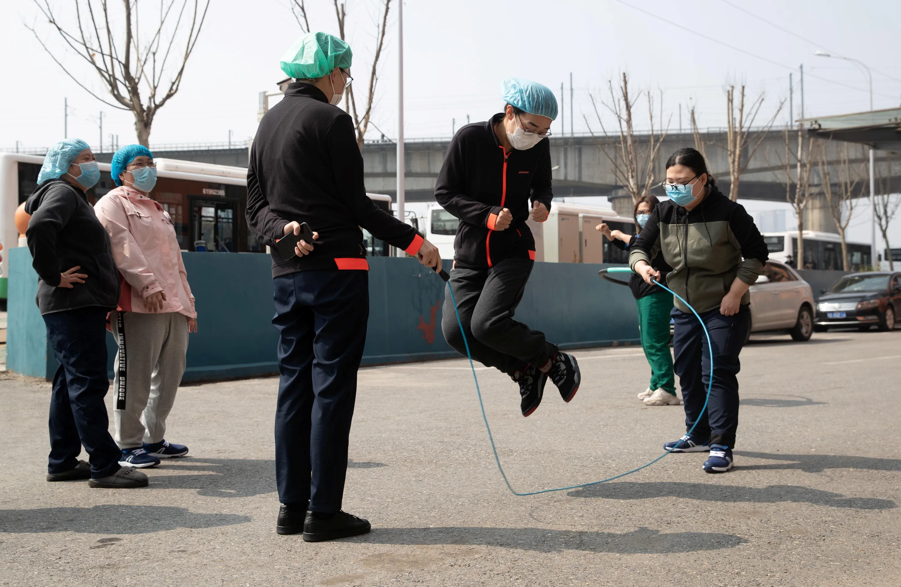 Medical workers wearing face masks jump rope as they take a break outside the hotel where they stay, in Wuhan, China March 5, 2020. (Photo by China Daily via Reuters)