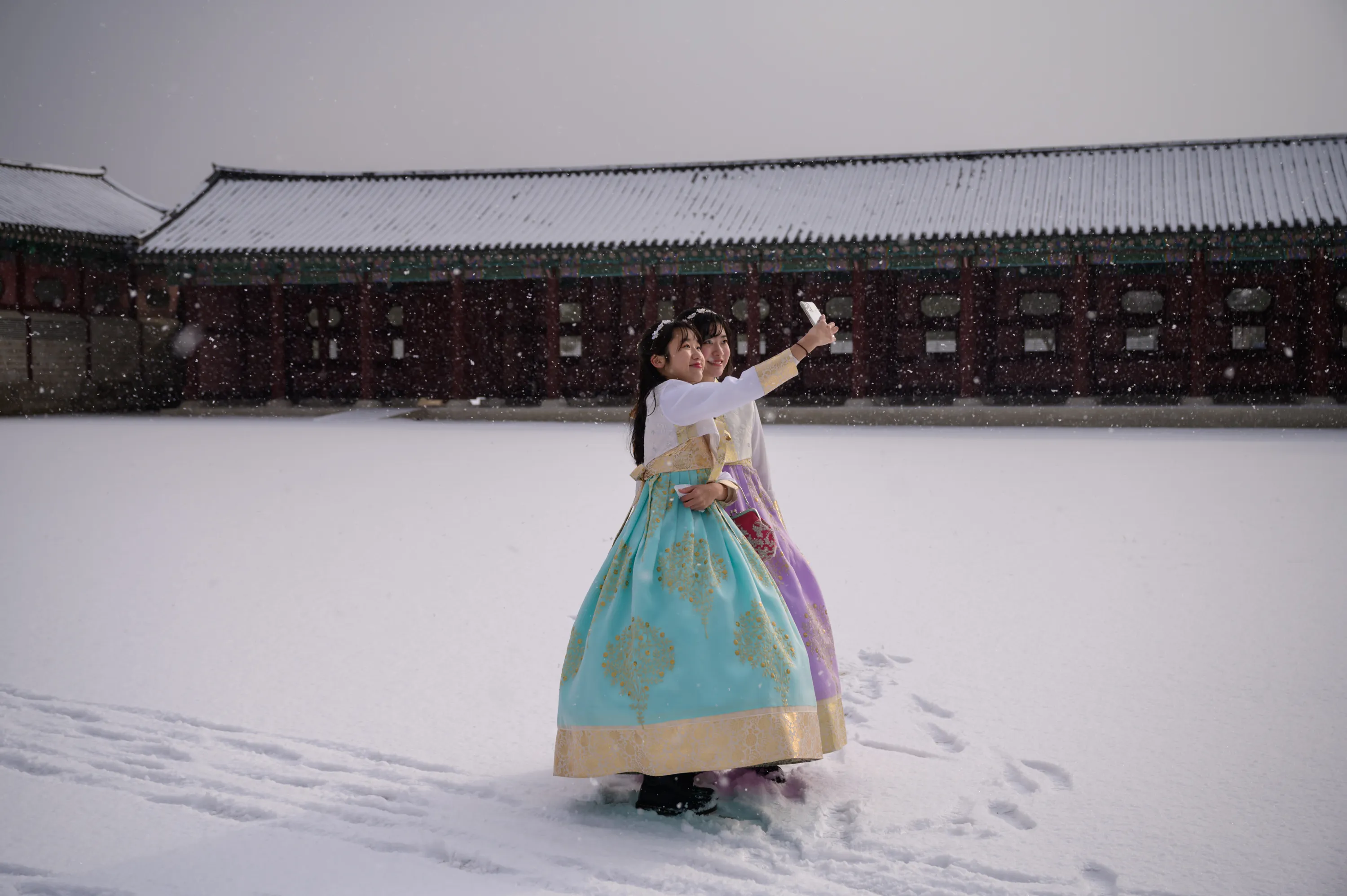 Visitors wearing traditional hanbok dress pose for selfie photos in the snow at Gyeongbokgung palace in Seoul on February 17, 2020. (Photo by Ed Jones/AFP Photo)