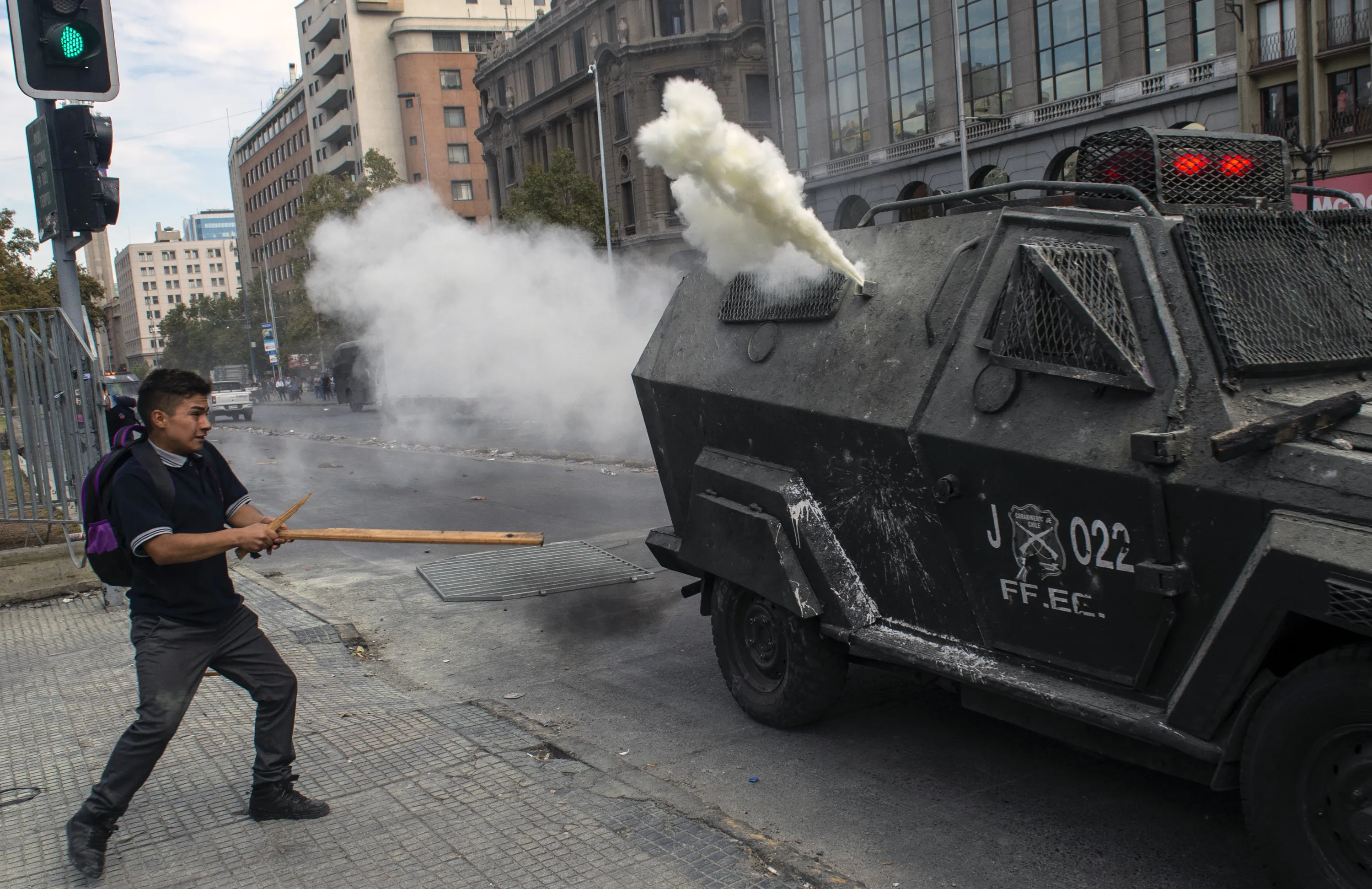 A Chilean student confronts riot police during a protest against Chile's President Sebastian Pinera government, on the second anniversary of his mandate, in Santiago on March 11, 2020. (Photo by Martin Bernetti/AFP Photo)