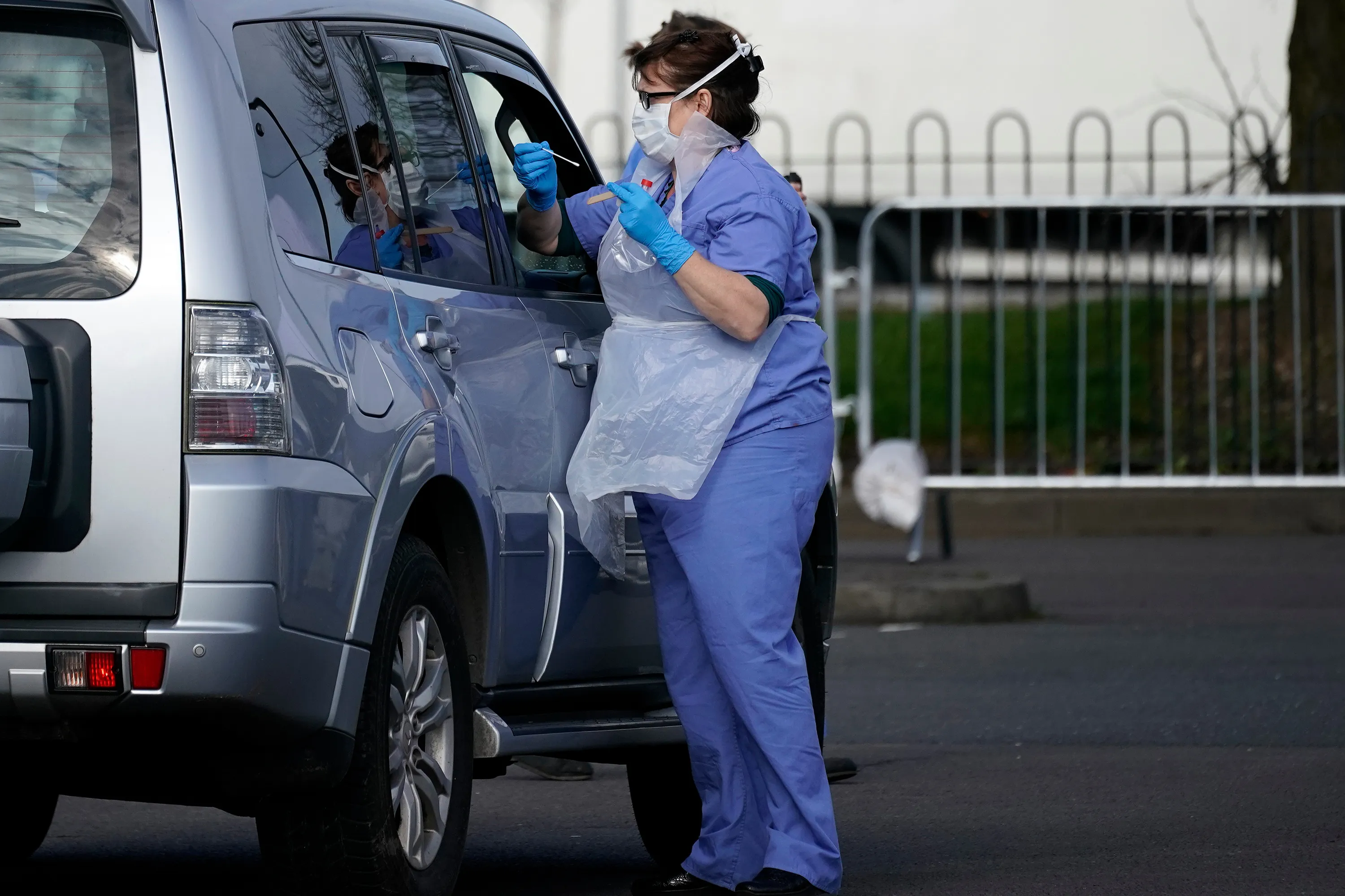 A member of the public is swabbed at a drive through Coronavirus testing site, set up in a car park, on March 12, 2020 in Wolverhampton, England. The National Health Service facility has been set up in a car park to allow people with NHS referrals to be swabbed for Covid-19. (Photo by Christopher Furlong/Getty Images)