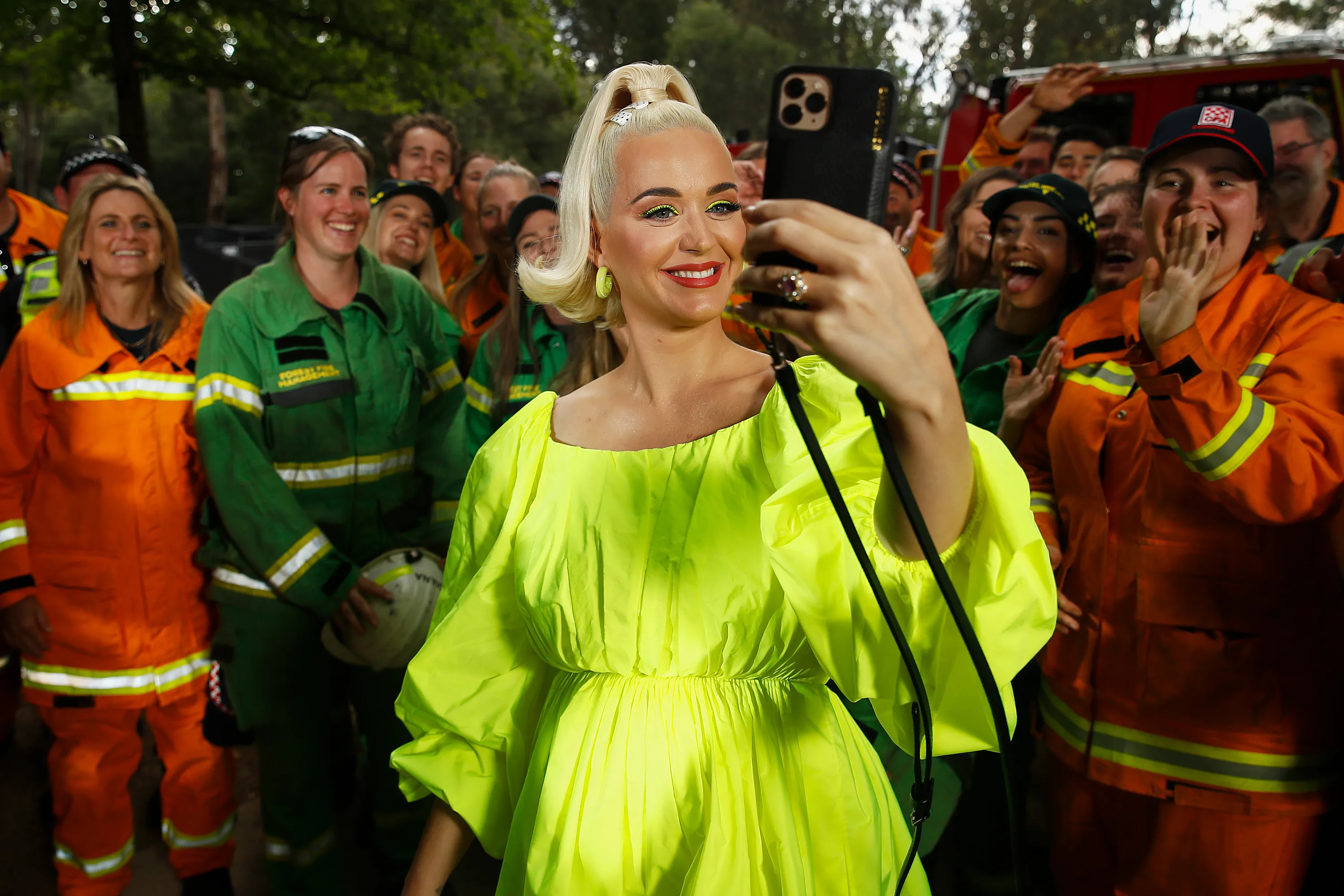 Katy Perry poses for a selfie on March 11, 2020 in Bright, Australia. The free Fight On concert was held for for firefighters and communities recently affected by the devastating bushfires in Victoria. (Photo by Daniel Pockett/Getty Images)