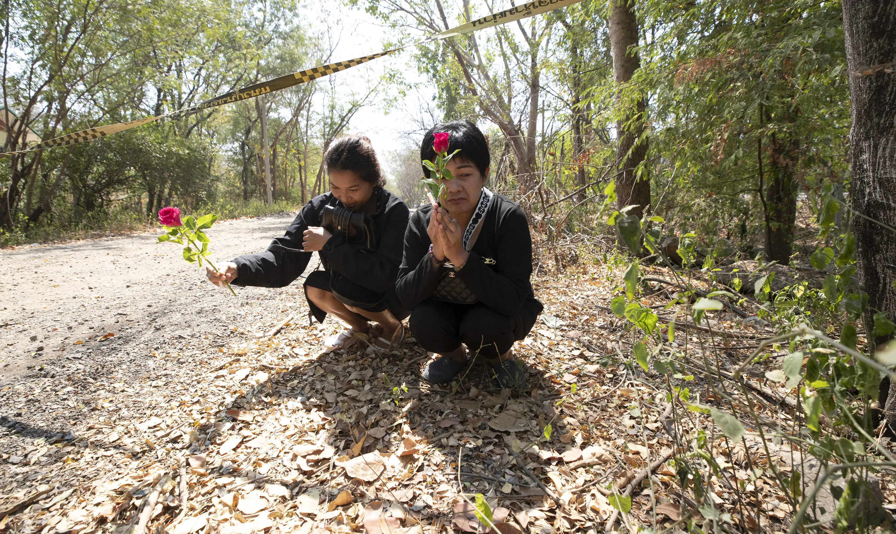 Mourners offer roses in condolence at the scene of the weekend's mass shooting that partially took place at the Wat Pa Sattharuam temple, Tuesday, February 11, 2020, in Nakhon Ratchasima, Thailand. A rogue Thai soldier whose rampage left 29 people dead and dozens more injured terrorized a Buddhist temple complex in rural northeastern Nakhon Ratchasima province on his way to a shopping mall, where he held shoppers hostage in a nearly 16-hour siege. (Photo by Sakchai Lalit/AP Photo)
