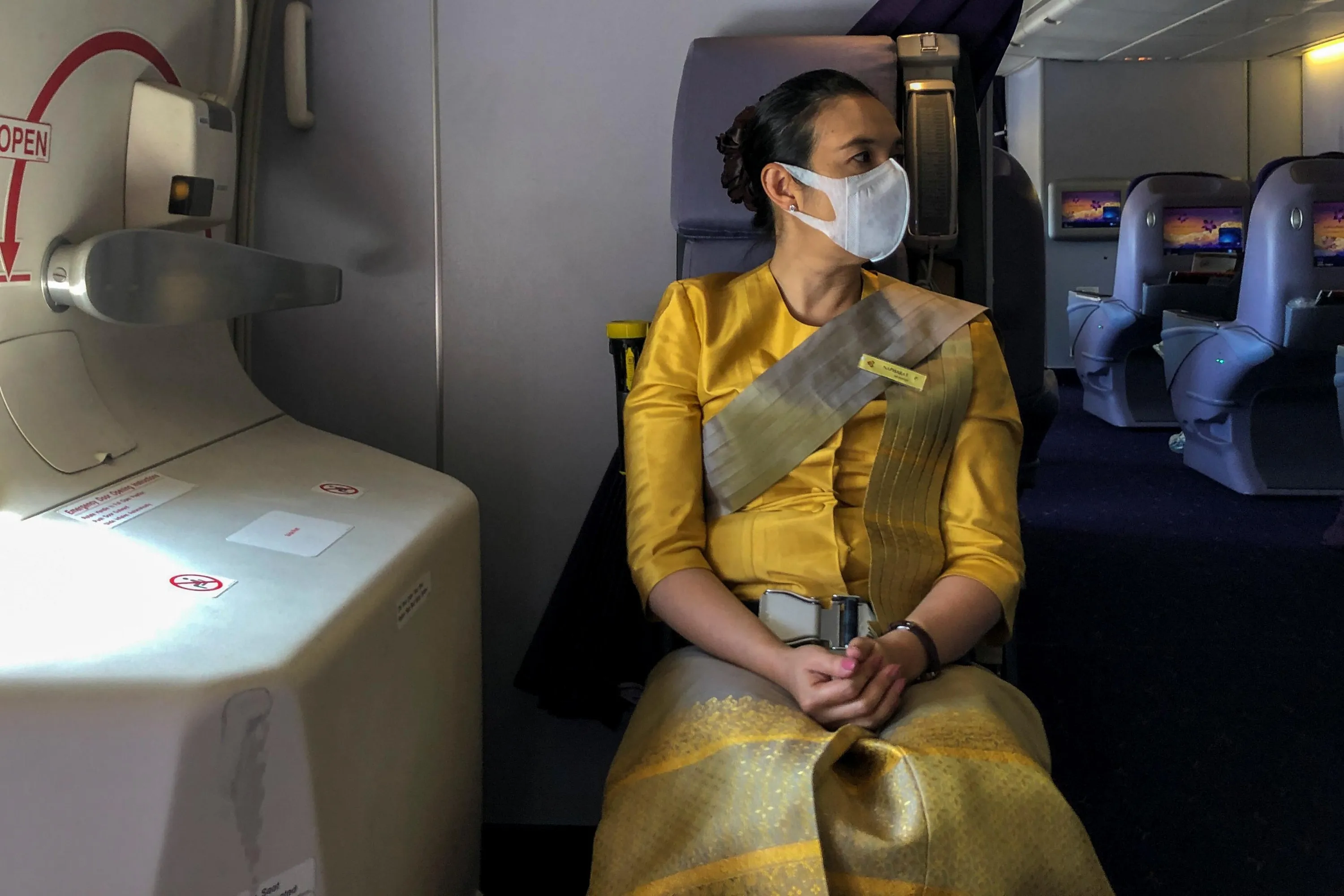A flight attendant wearing a protective face mask is pictured during a flight from Sydney to Bangkok, February 1, 2020. (Photo by Jorge Silva/Reuters)