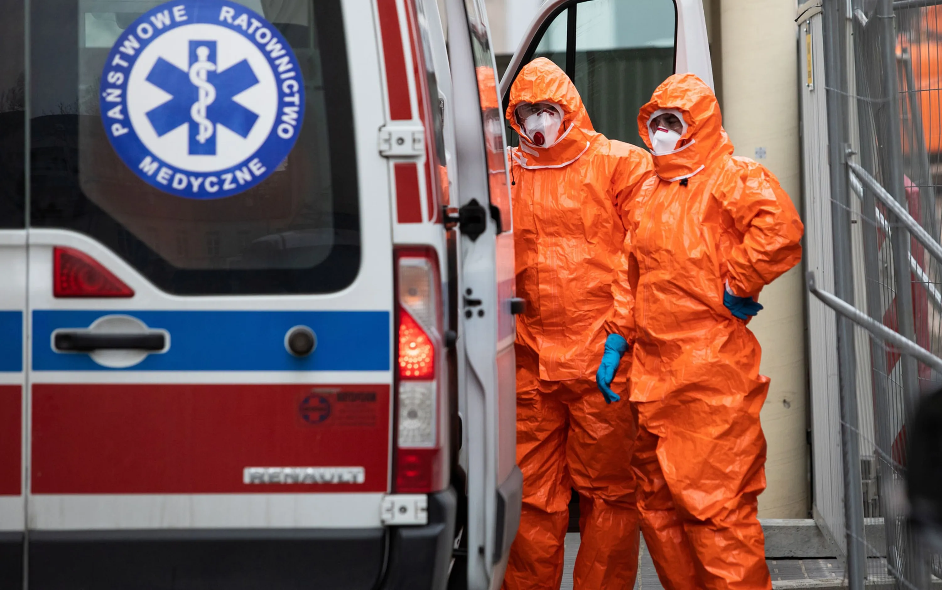 Medical staff in protective gear stand near an ambulance upon the arrival at the infectious ward of the Public Hospital in Lublin, Poland on March 12, 2020. (Photo by Jakub Orzechowski/Agencja Gazeta via Reuters)