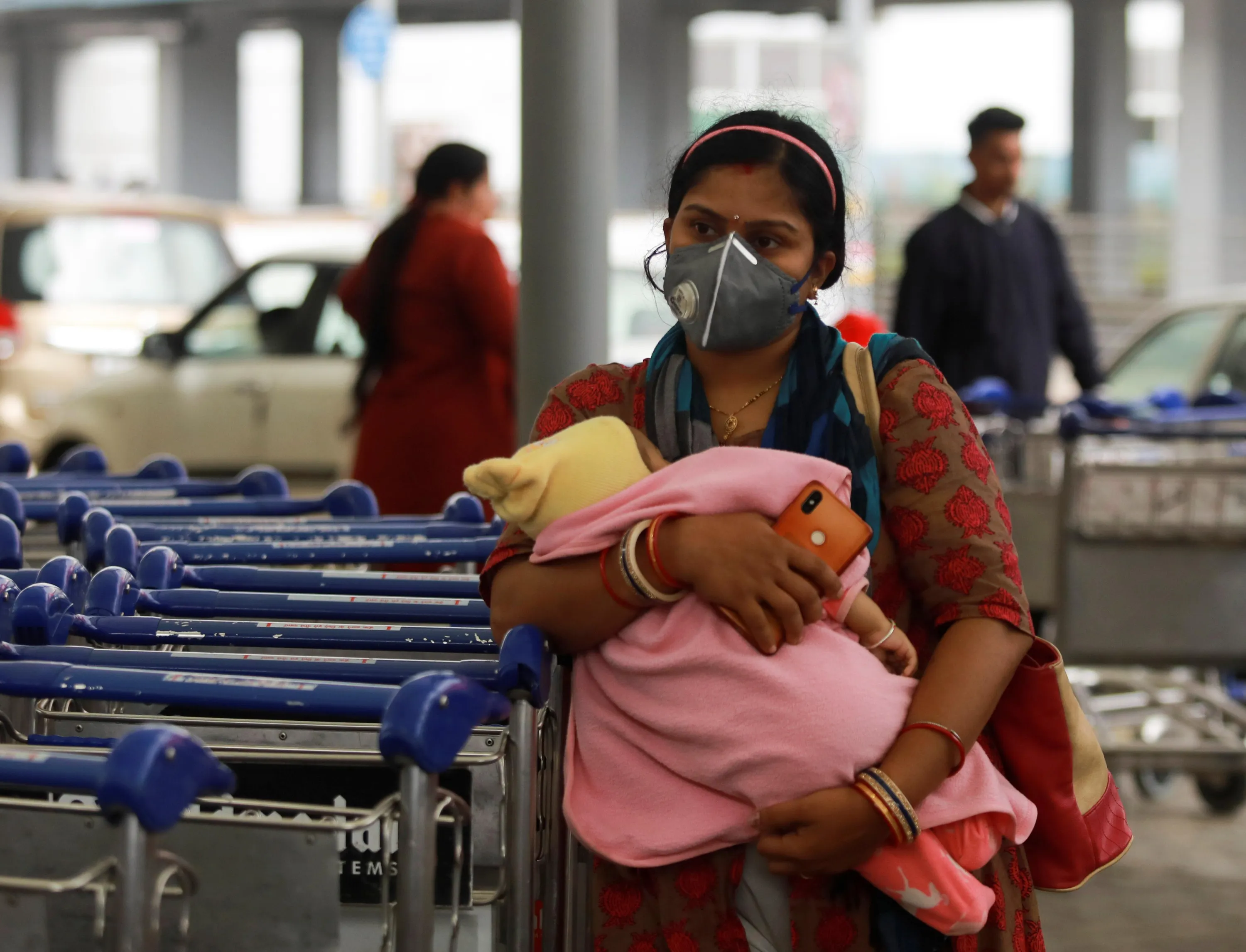 A passenger wearing a protective mask holds a baby as she waits outside an airport following an outbreak of the coronavirus disease (COVID-19), in New Delhi, India, March 14, 2020. (Photo by Anushree Fadnavis/Reuters)
