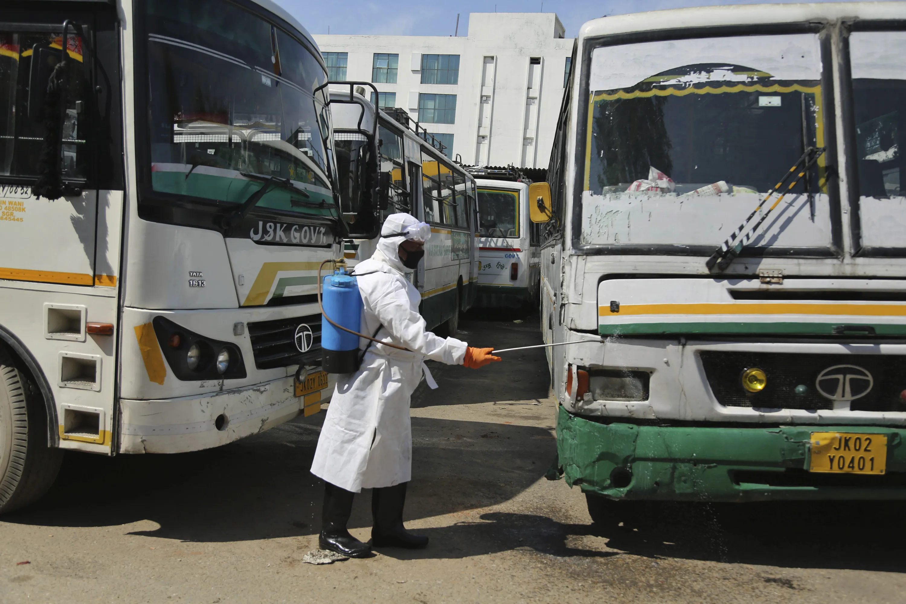 An Indian health worker sprays disinfects on a state passenger bus as a precaution against COVID-19 in Jammu, India, Monday, March 16, 2020. For most people, the new coronavirus causes only mild or moderate symptoms. For some, it can cause more severe illness, especially in older adults and people with existing health problems. (Photo by Channi Anand/AP Photo)