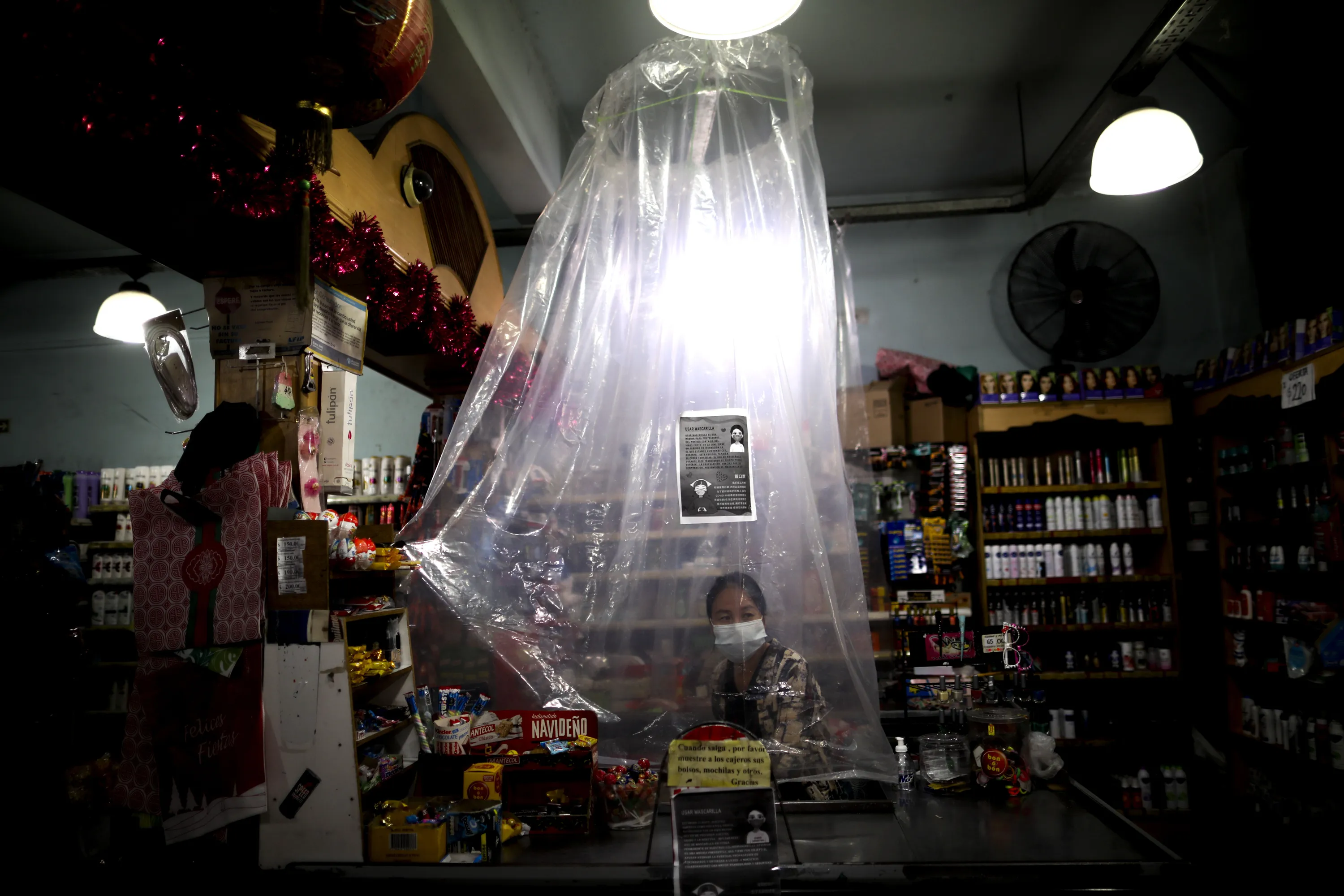 A supermarket cashier waits for costumers behind a makeshift plastic curtain as a precaution against the spread of the new coronavirus, in Buenos Aires, Argentina, Monday, March 16, 2020. (Photo by Natacha Pisarenko/AP Photo)
