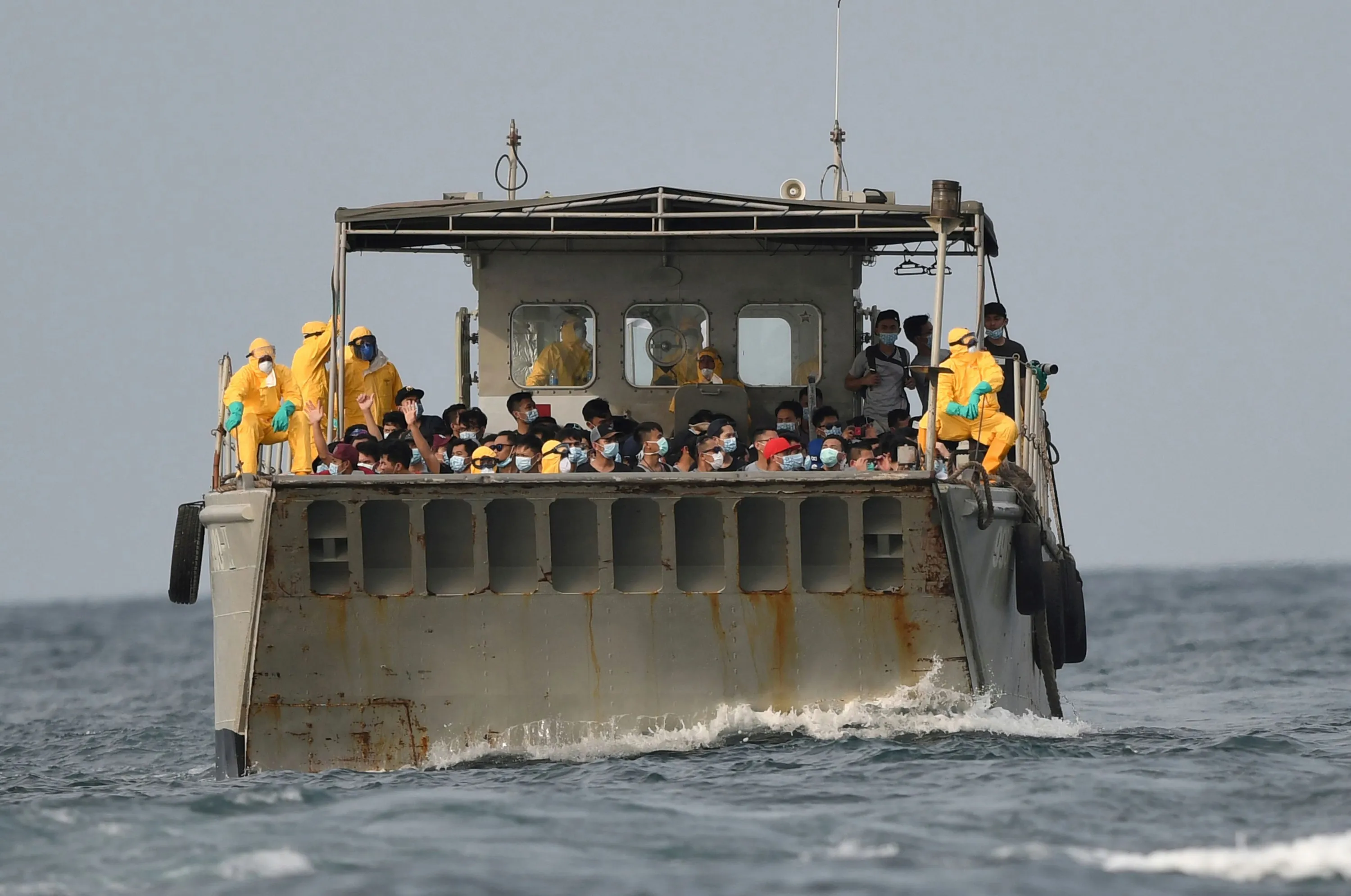 The KRI Dr. Soeharso hospital ship ferrying Indonesia nationals who were evacuated from the World Dream cruise ship, arrive at Sebaru Kecil Islands for observation, in Thousand Islands, Jakarta, Indonesia, February 28, 2020. in this photo taken by Antara Foto. (Photo by Akbar Nugroho Gumay/Antara Foto via Reuters)
