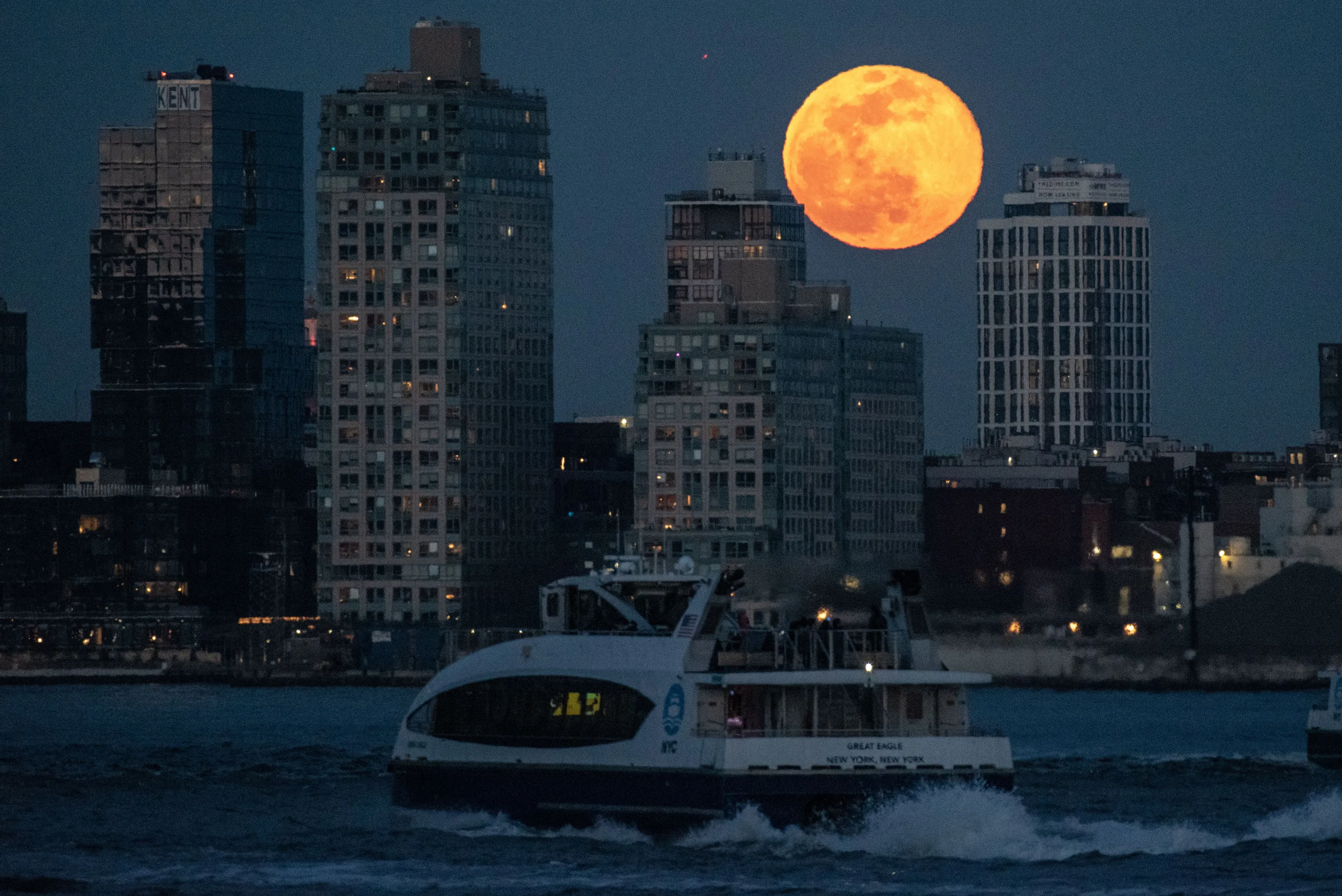 A Full Worm Supermoon rises over the Williamsburg Waterfront Apartments in Brooklyn, New York on March 9, 2020. (Photo by Erik Pendzich/Rex Features/Shutterstock)