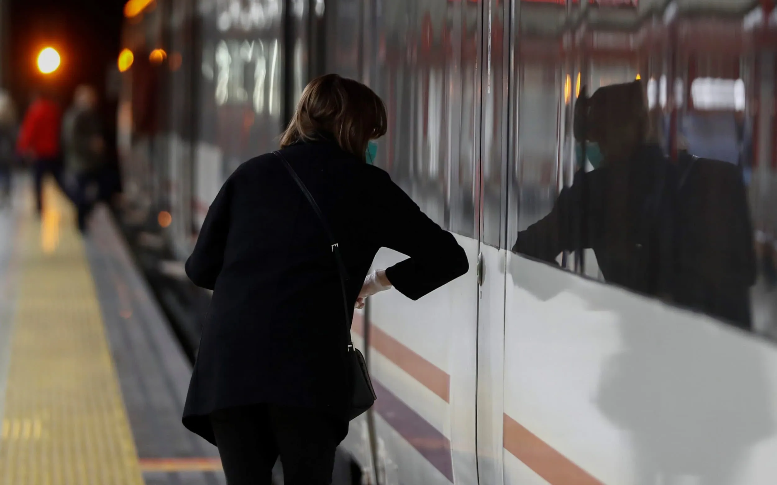 A masked commuter opens the train's doors with her elbow at a platform at Nuevos Ministerios commuter train station in Madrid, Spain, 19 March 2020. Spanish faces its fifth day of lockdown to contain the spreading of coronavirus outbreak. (Photo by Mariscal/EPA/EFE/Rex Features/Shutterstock)