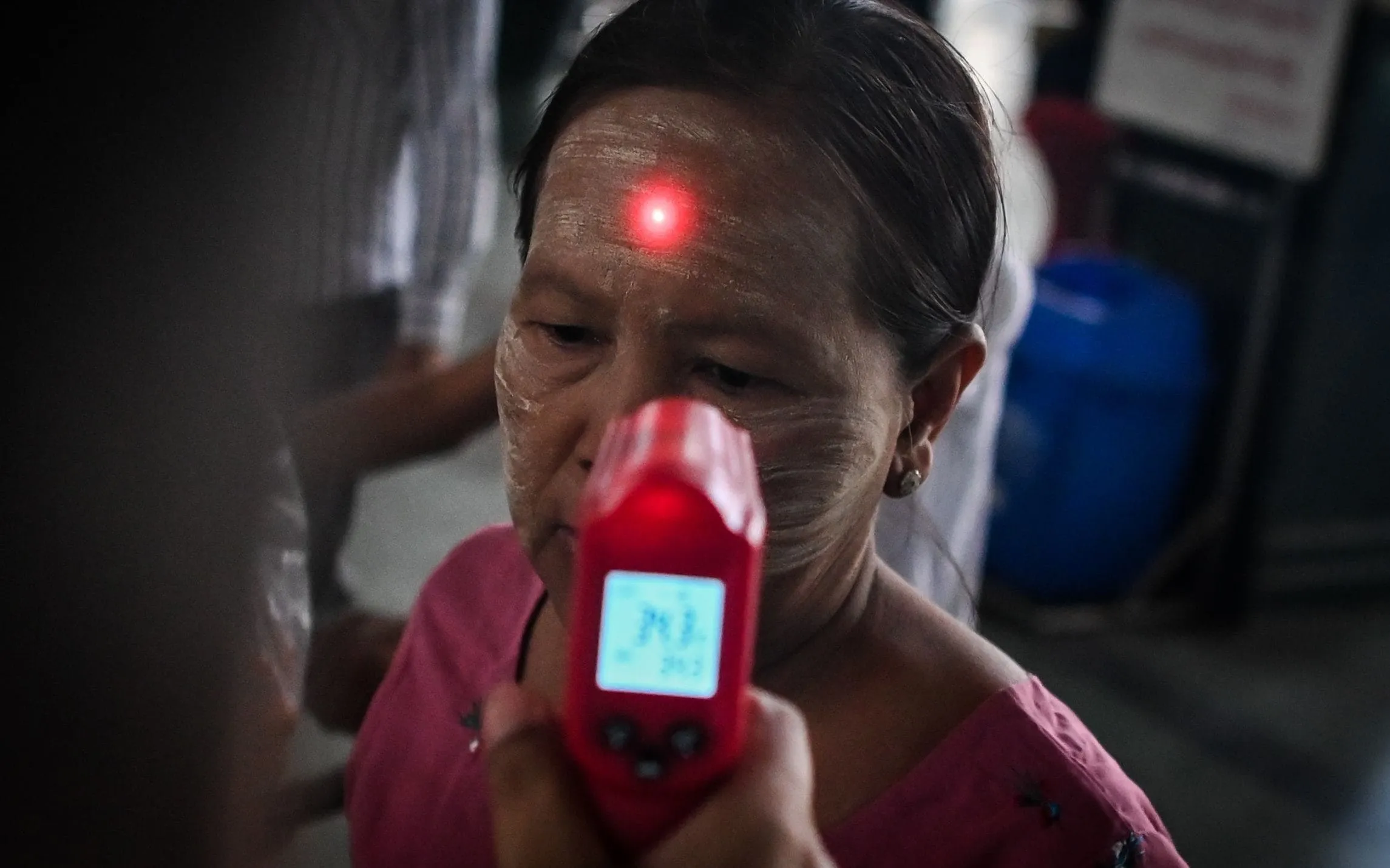 A woman wearing traditional face cosmetic has her temperature taken as a preventive measure against the COVID-19 coronavirus at the central railway station in Yangon on March 19, 2020. (Photo by Ye Aung Thu/AFP Photo)