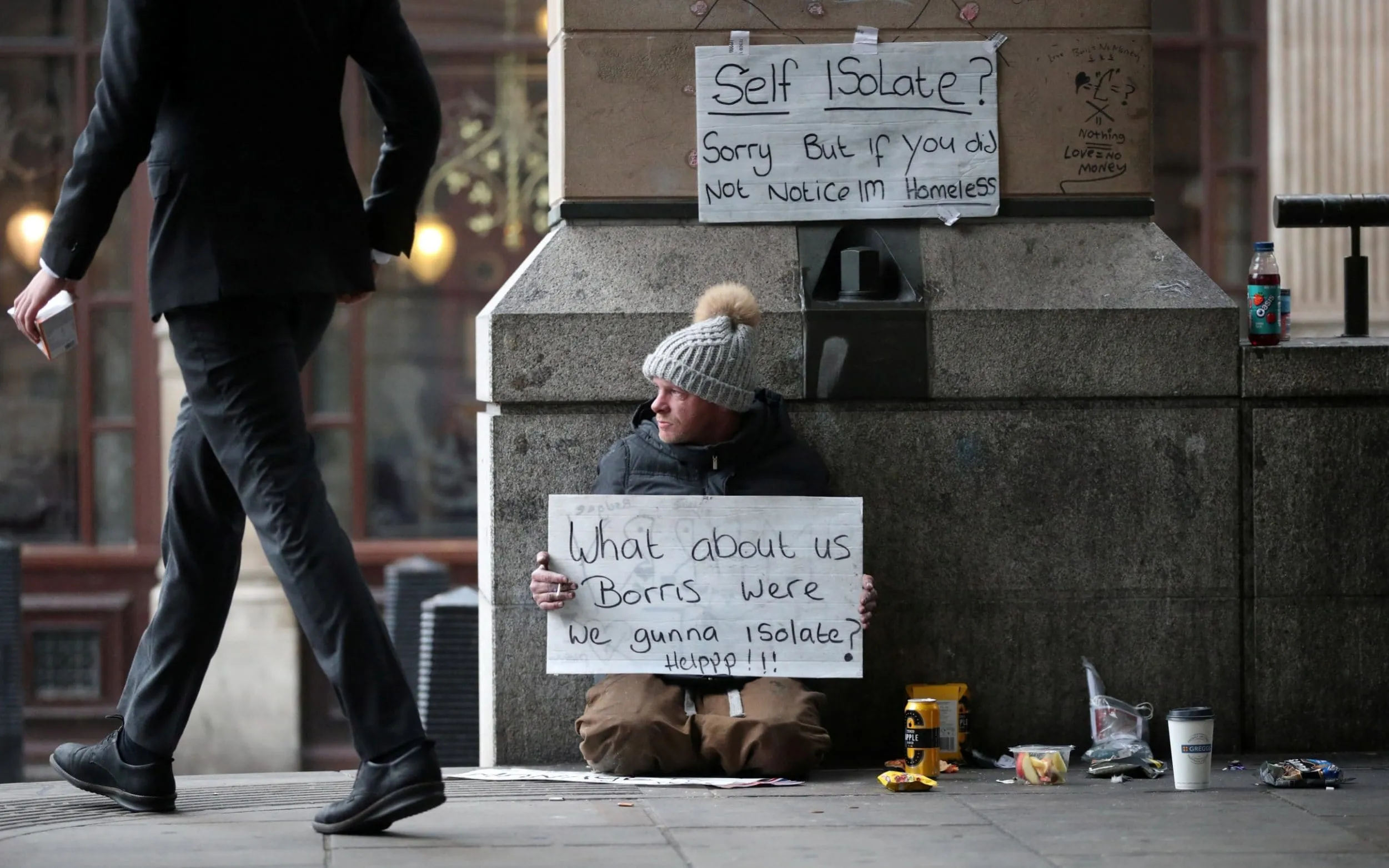 A homeless man holds up a sign outside Westminster underground station as the spread of the coronavirus disease (COVID-19) continues, in London, Britain, March 19, 2020. (Photo by Hannah McKay/Reuters)
