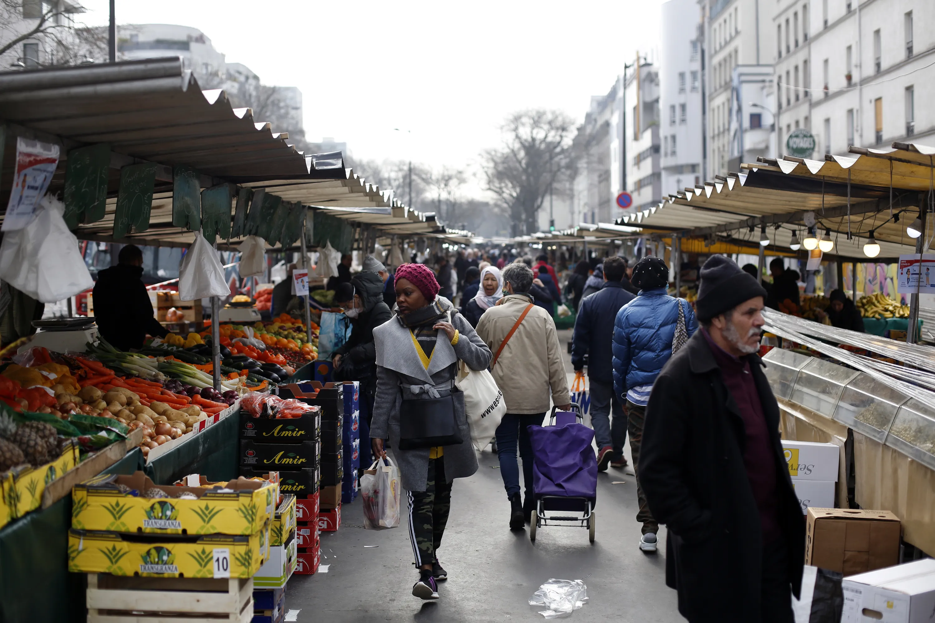 People walk in the open air market of Belleville, in Paris, Friday, March 20, 2020. French President Emmanuel Macron said that for 15 days starting at noon on Tuesday, people will be allowed to leave the place they live only for necessary activities such as shopping for food, going to work or taking a walk. (Photo by Thibault Camus/AP Photo)