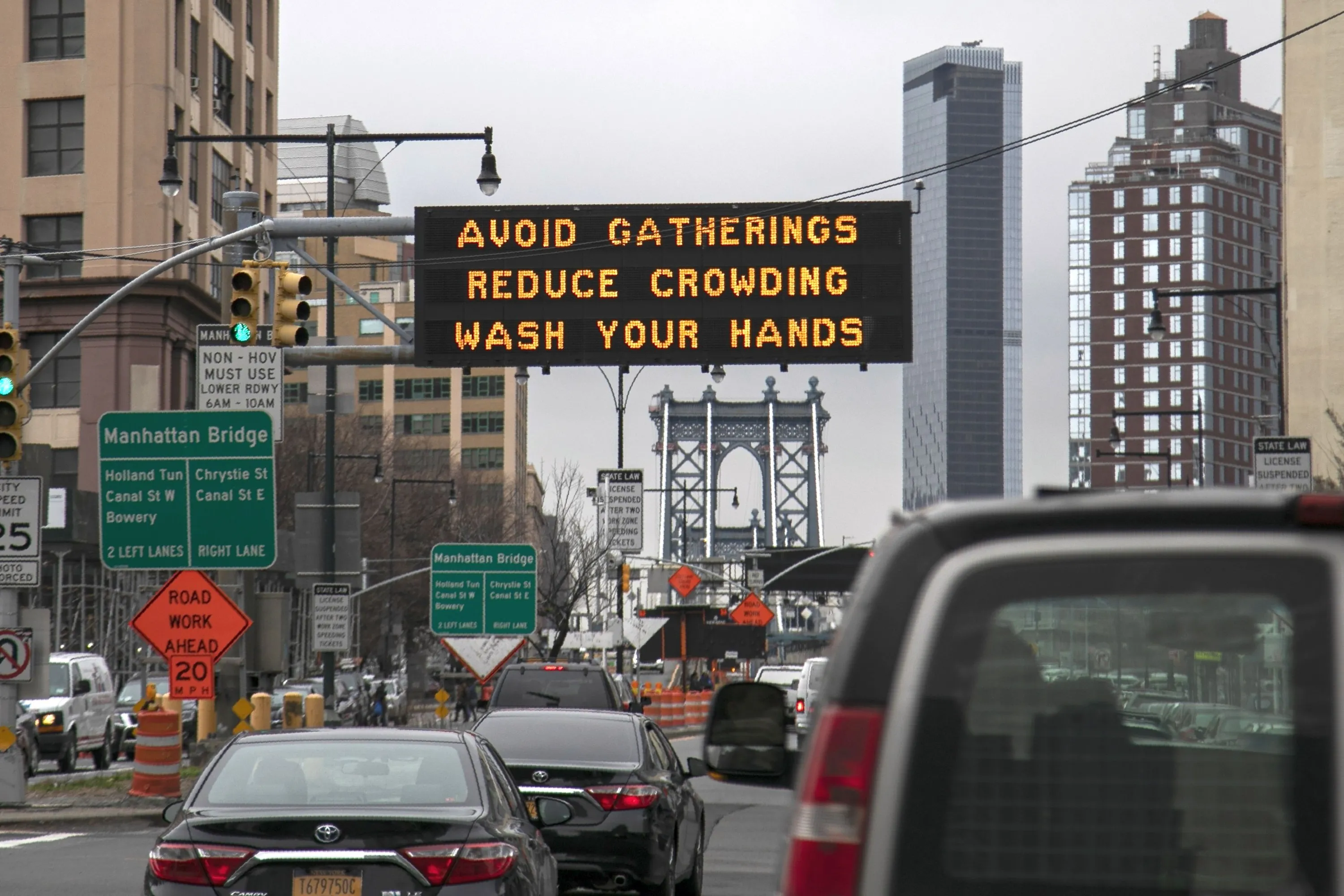 The Manhattan bridge is seen in the background of a flashing sign urging commuters to avoid gatherings, reduce crowding and to wash hands in the Brooklyn borough of New York, on Thursday, March 19, 2020. In a matter of days, millions of Americans have seen their lives upended by measures to curb the spread of the new coronavirus. For most people, the new coronavirus causes only mild or moderate symptoms. For some it can cause more severe illness. (Photo by Wong Maye-E/AP Photo)