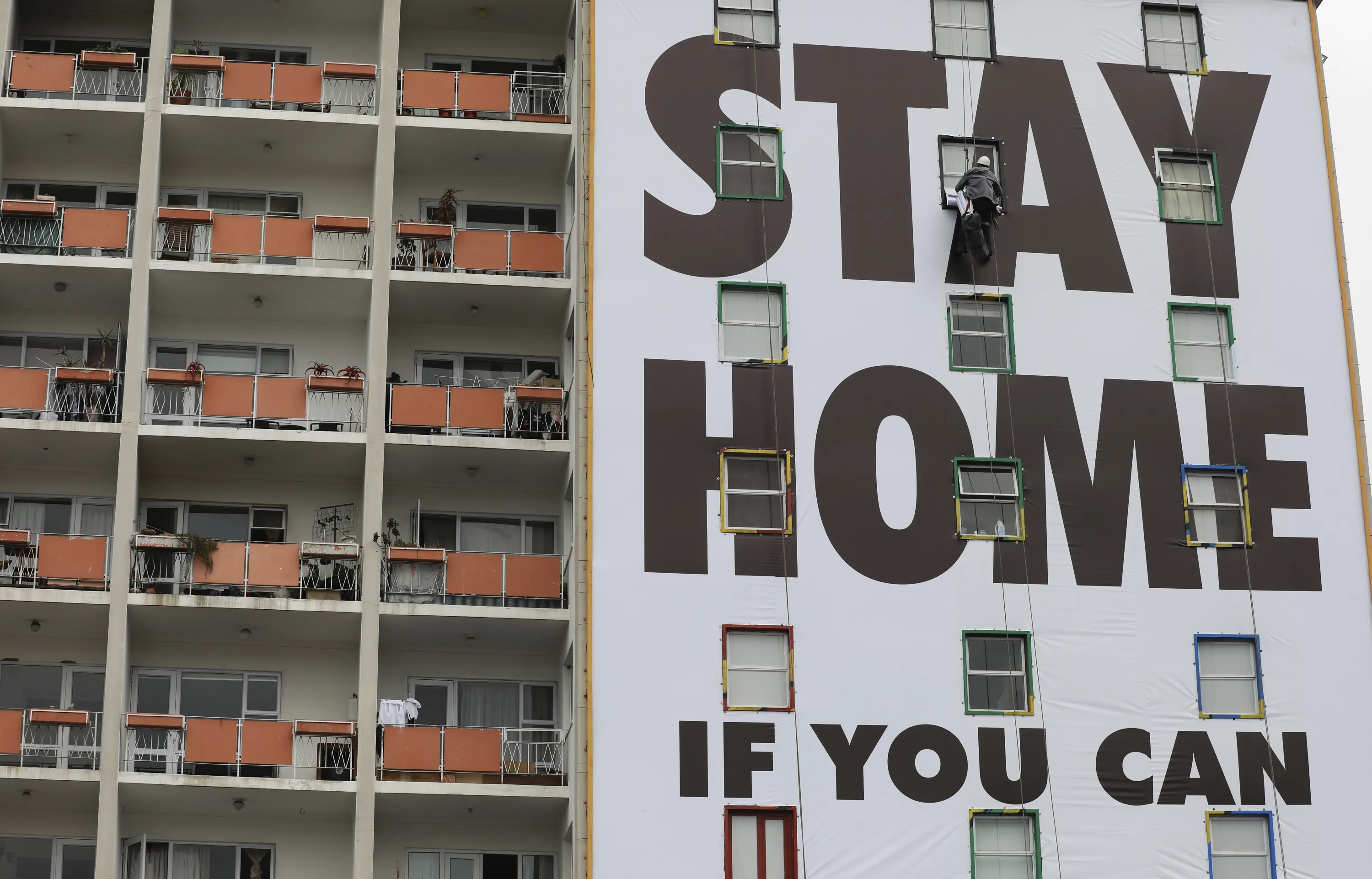 A billboard is installed on an apartment building in Cape Town, South Africa, Wednesday, March 25, 2020, before the country of 57 million people, will go into a nationwide lockdown for 21 days from Thursday to fight the spread of the new coronavirus. (Photo by Nardus Engelbrecht/AP Photo)